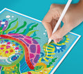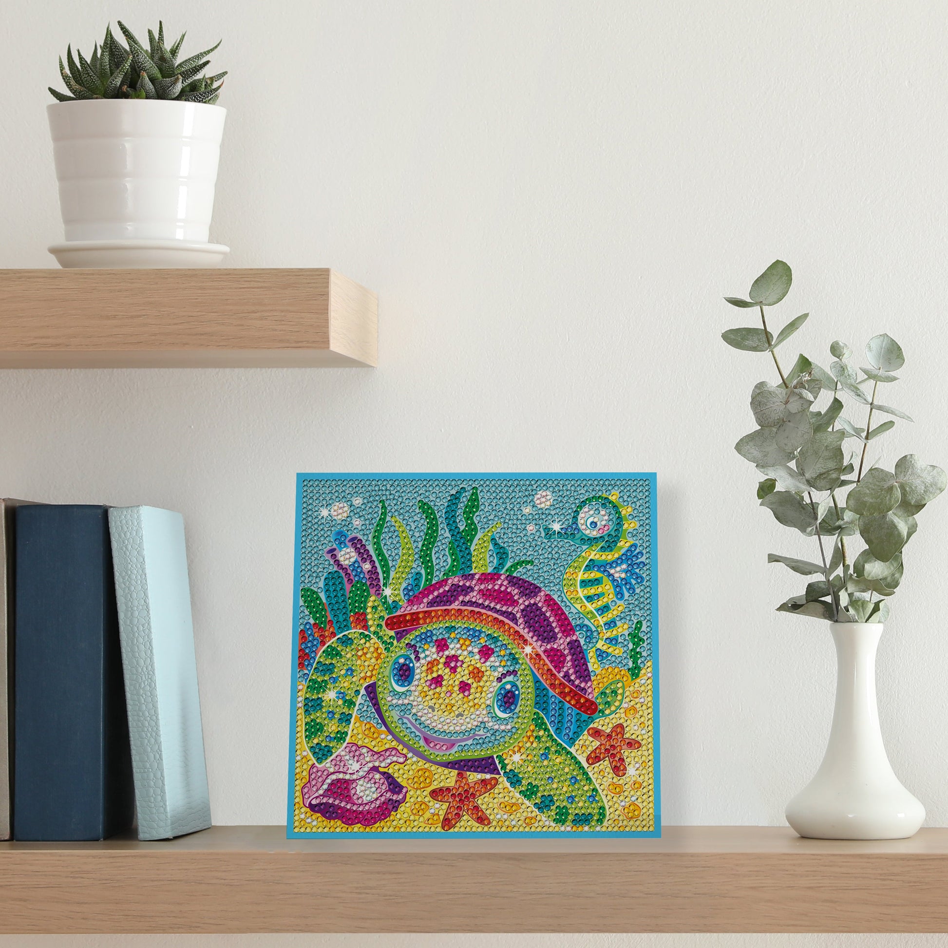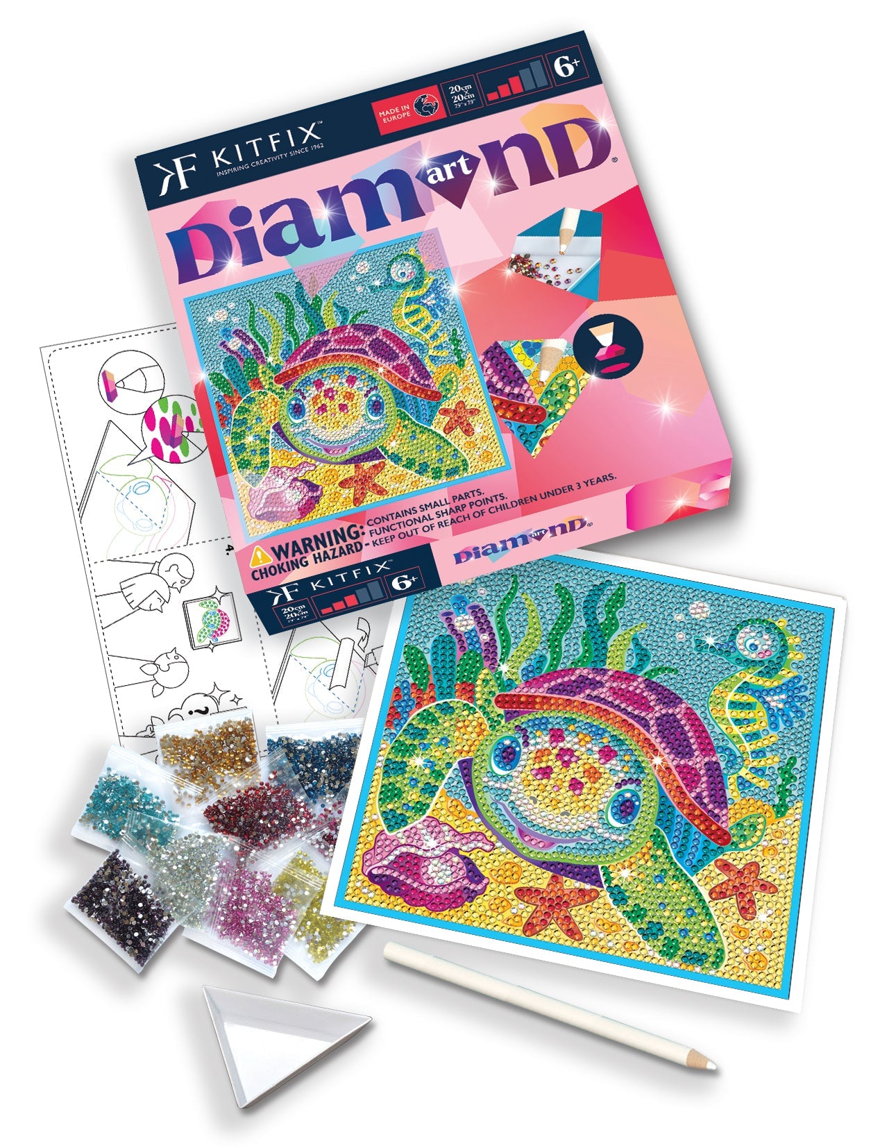 The Turtle Diamond Art craft kit from the Classic range, including a self-adhesive picture, gems, pencil, pencil sharpener, plastic tray and instructions.