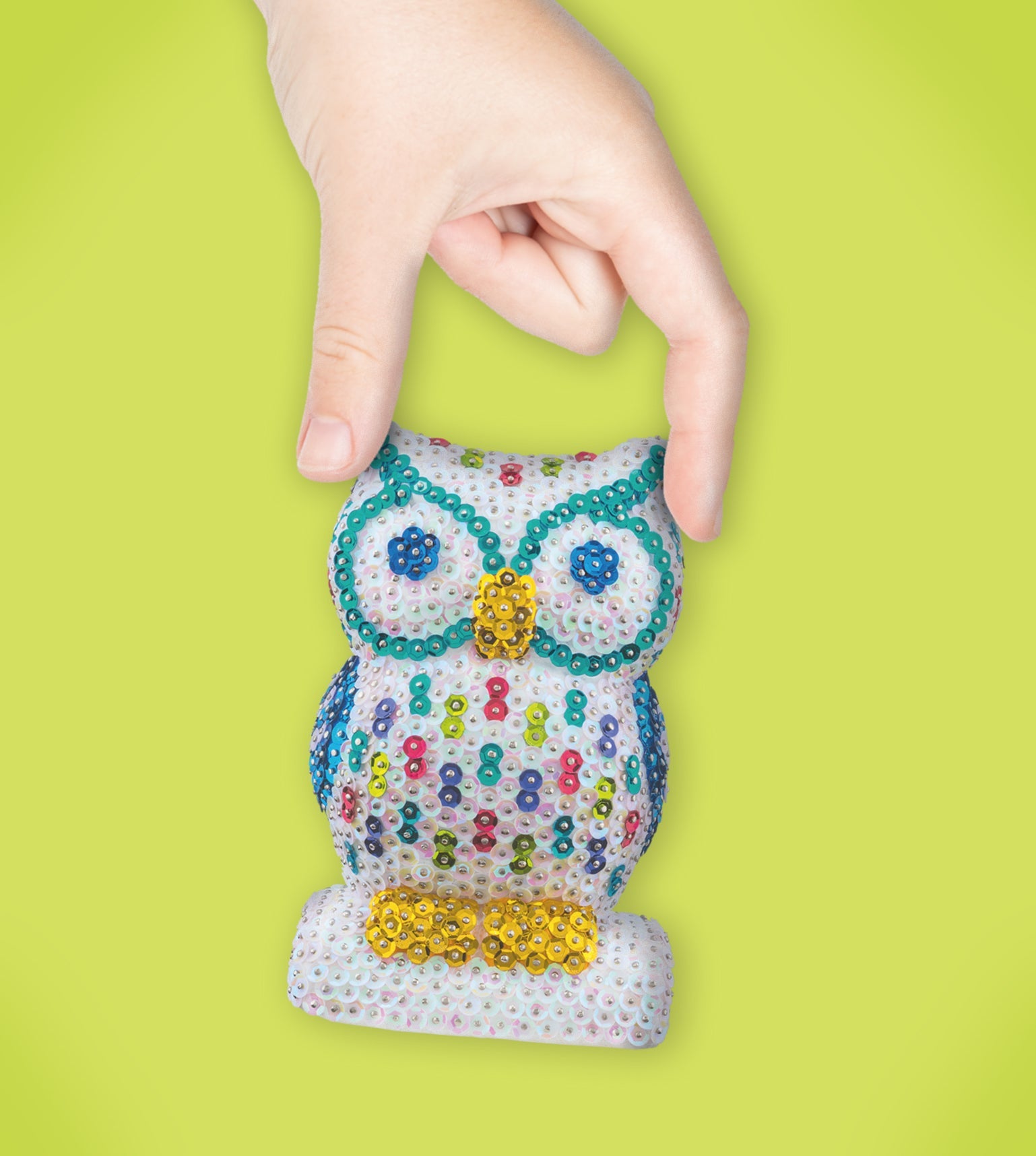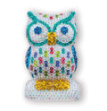 The Owl Sequin Art craft kit from the 3D range, including a polystyrene model, coloured sequins, pins, beads and instructions.