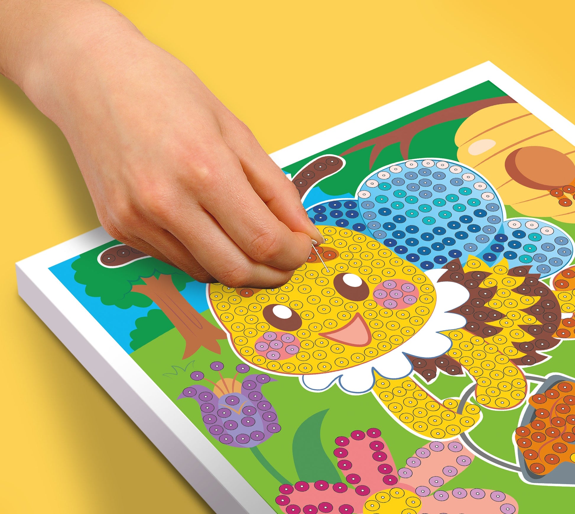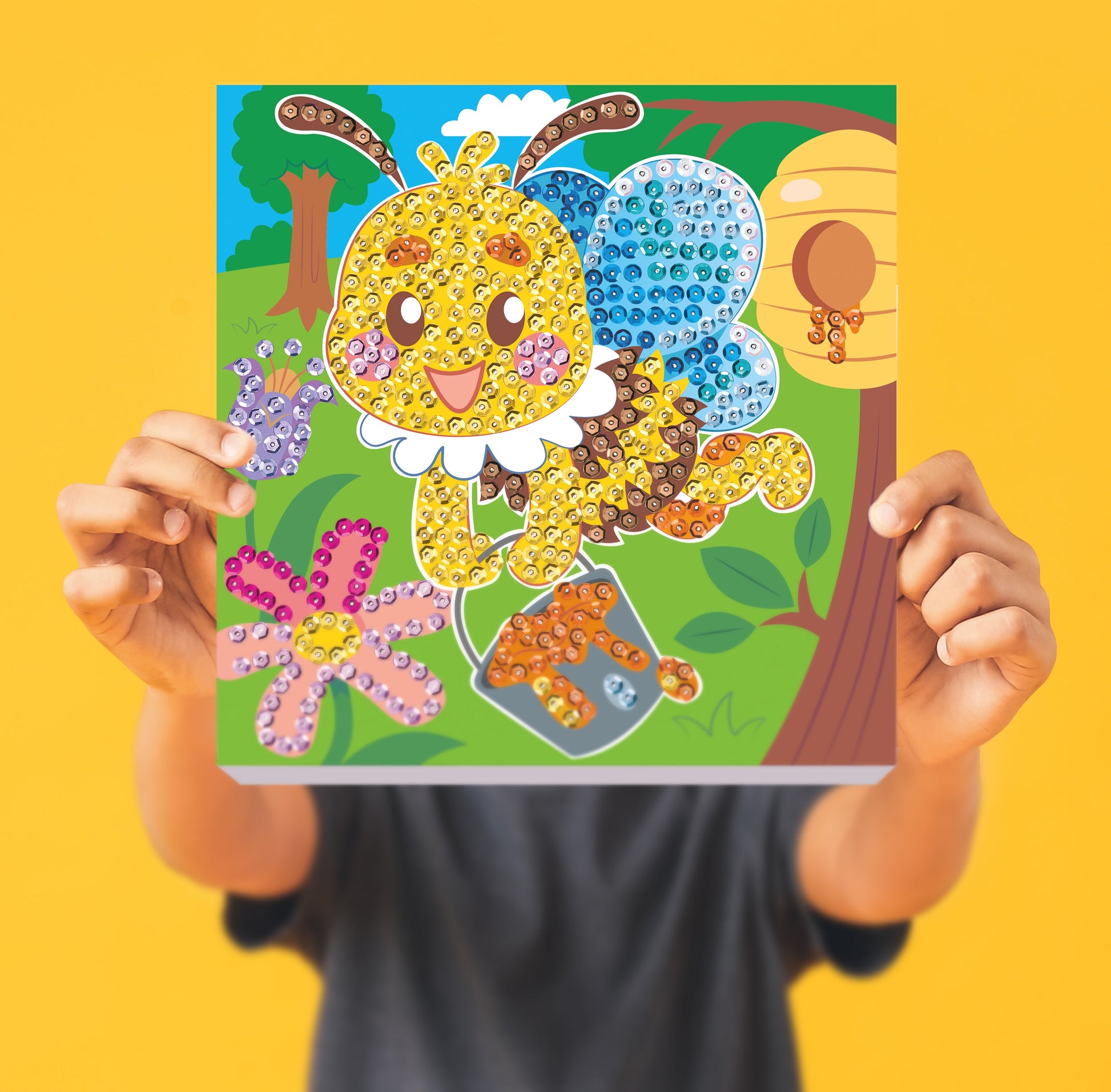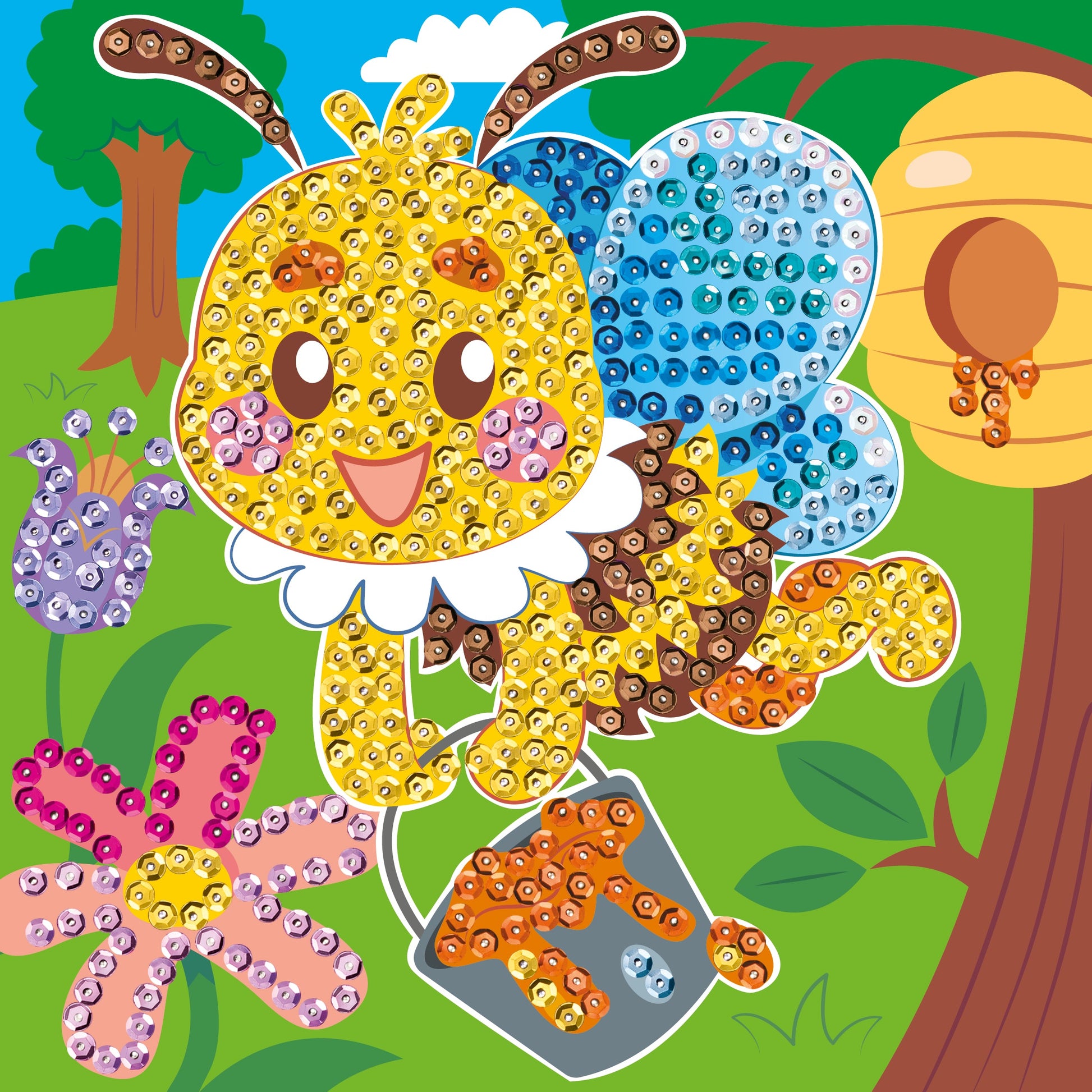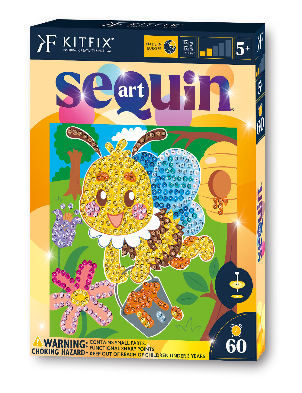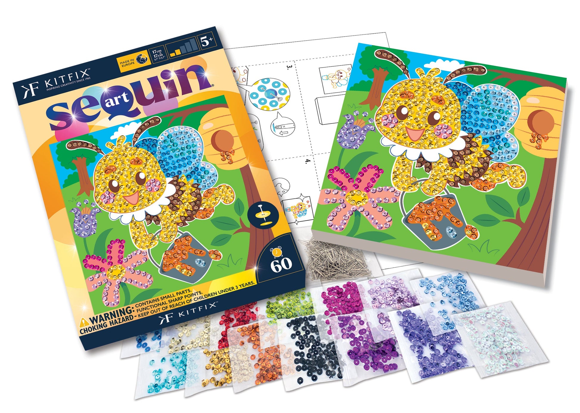 The Bee Sequin Art craft kit from the 60 range, including a polystyrene base, coloured picture, coloured sequins, pins, instructions