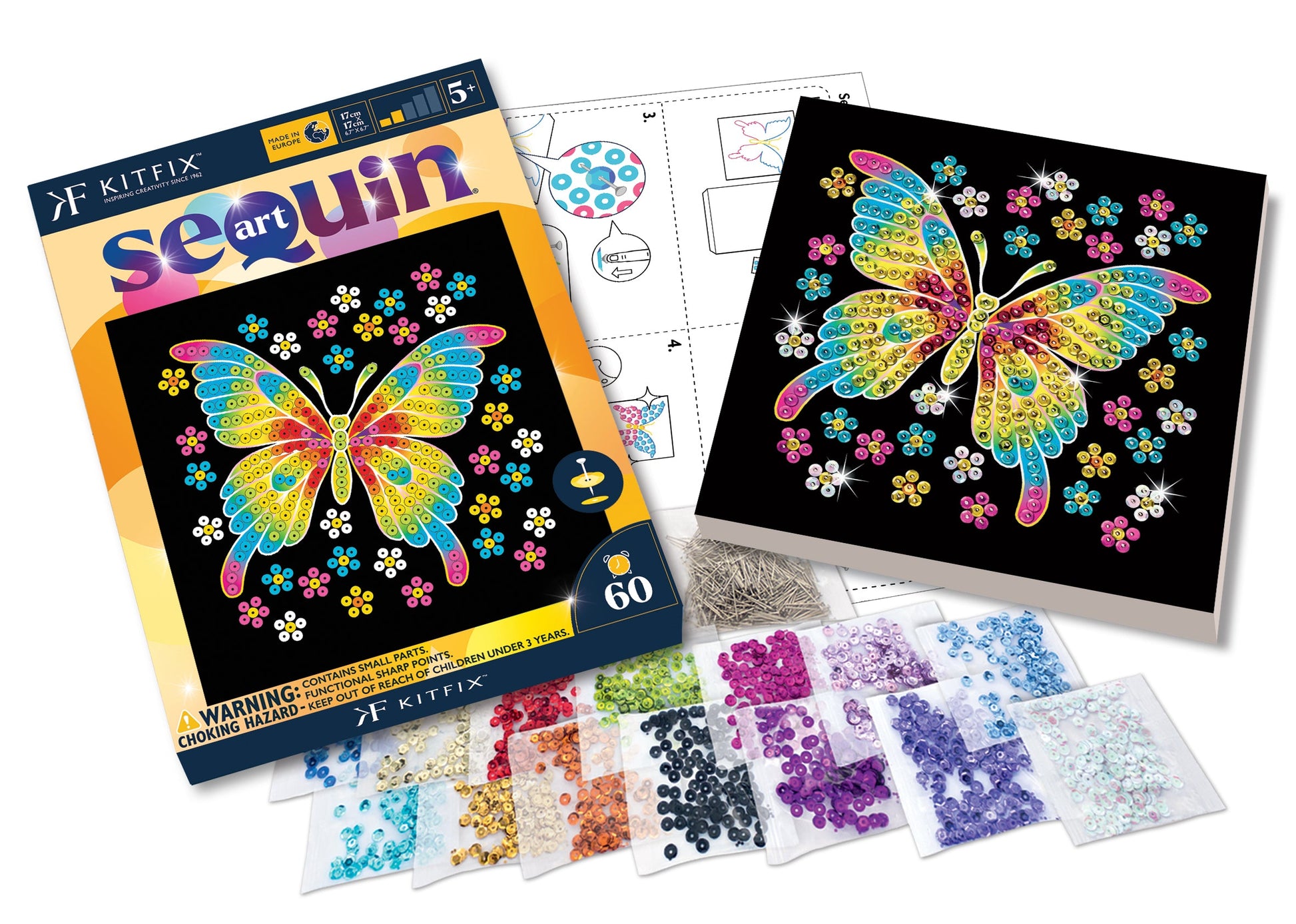 The Butterfly Sequin Art craft kit from the 60 range, including a polystyrene base, coloured picture, coloured sequins, pins, instructions