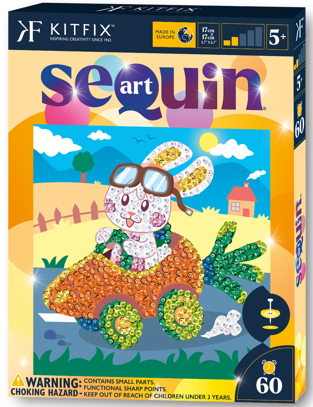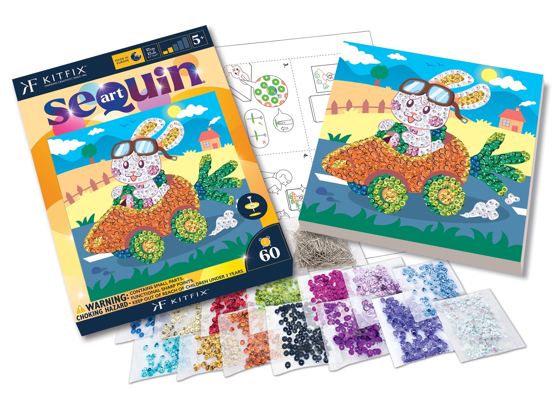 The Carrot Car Sequin Art craft kit from the 60 range, including a polystyrene base, coloured picture, coloured sequins, pins, instructions