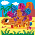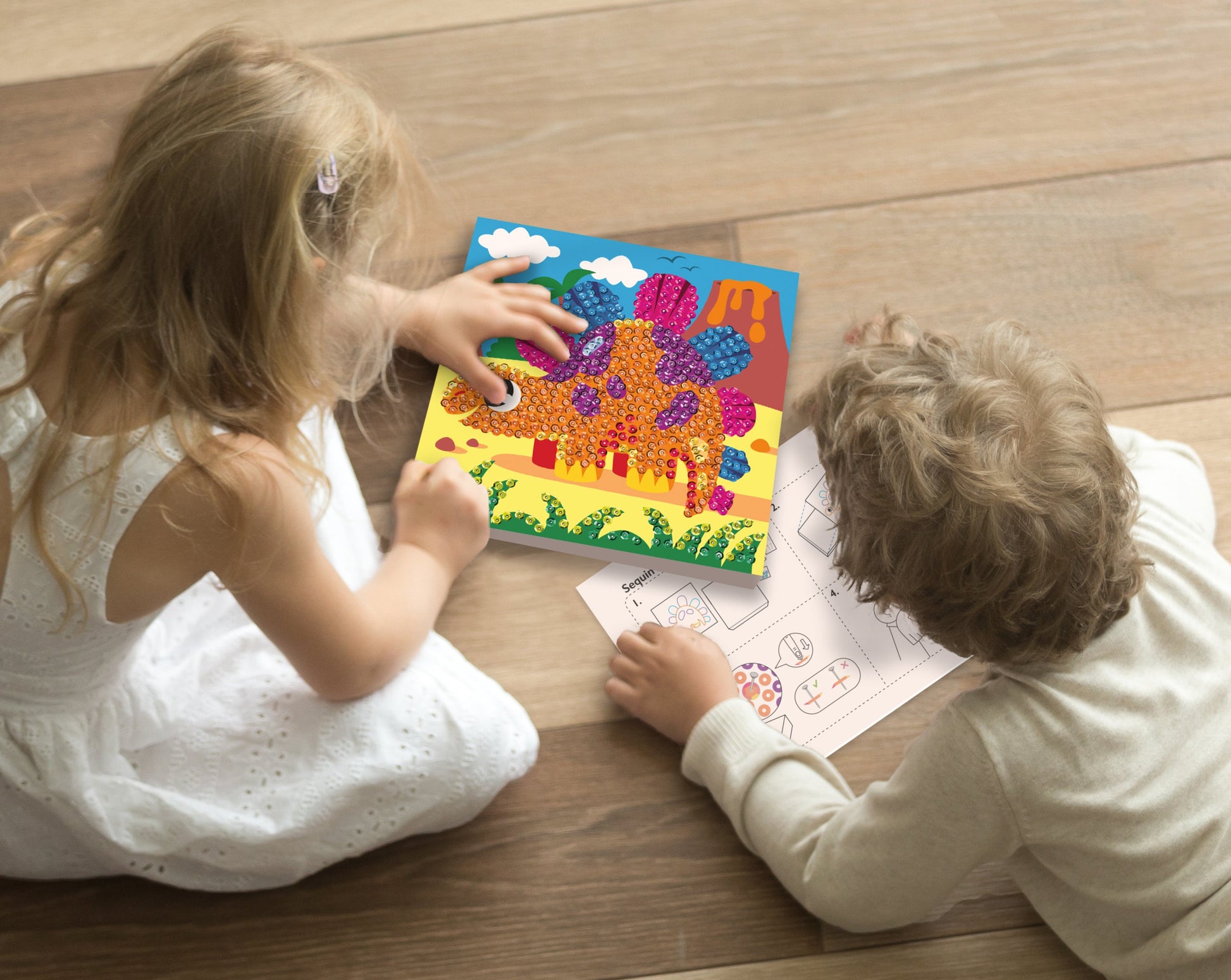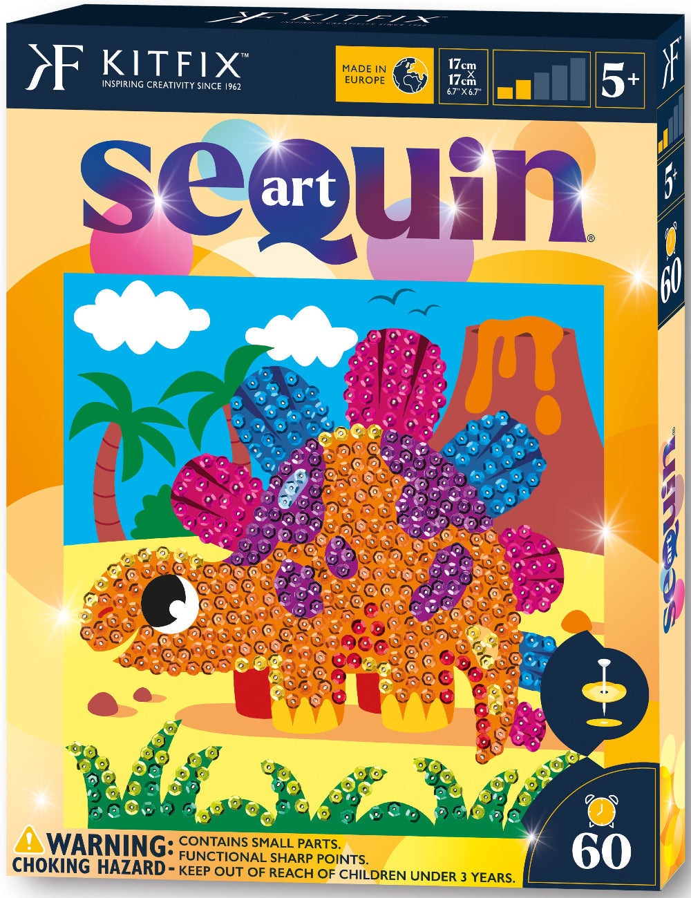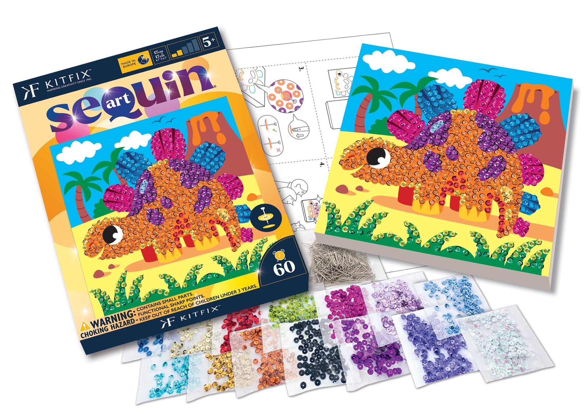 The Dino Sequin Art craft kit from the 60 range, including a polystyrene base, coloured picture, coloured sequins, pins, instructions
