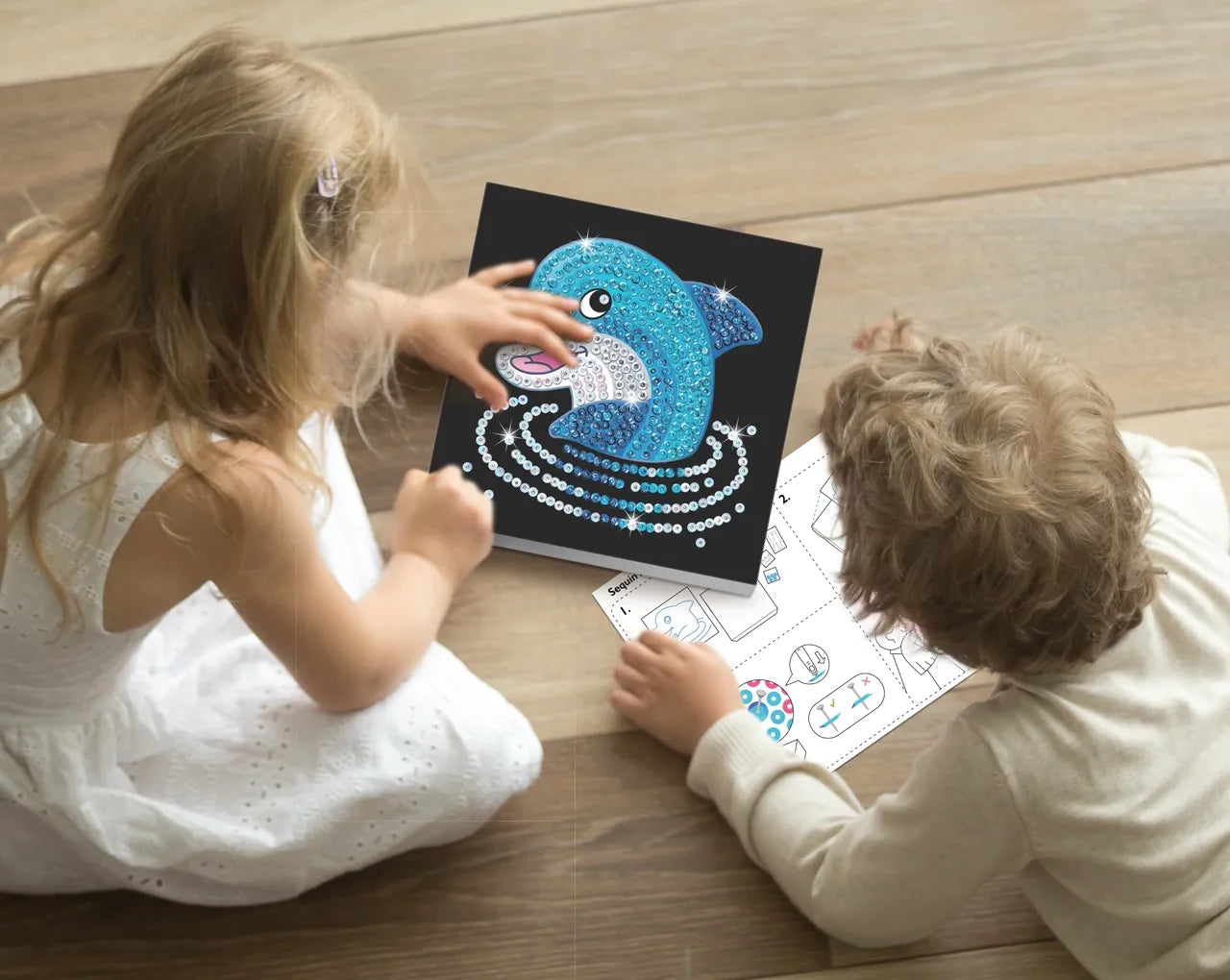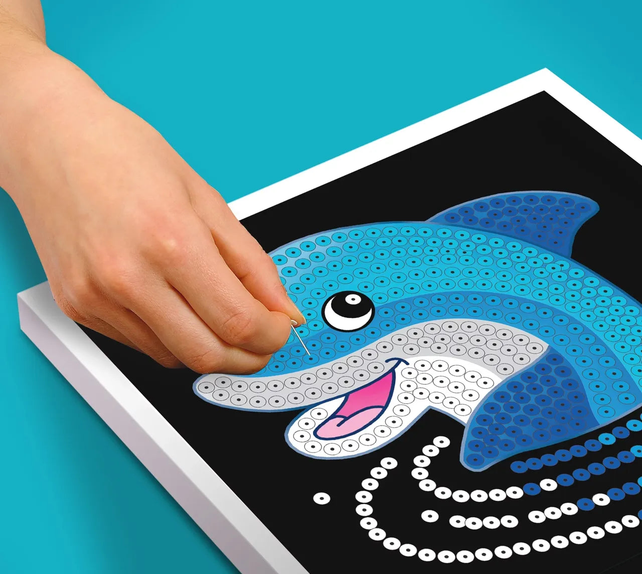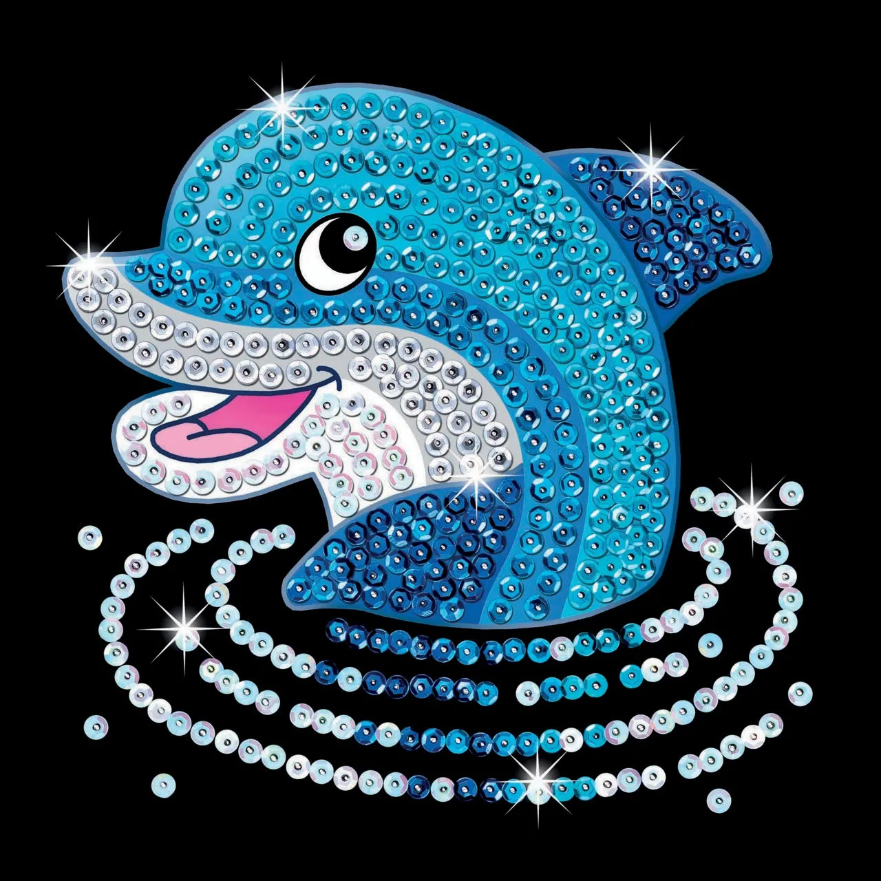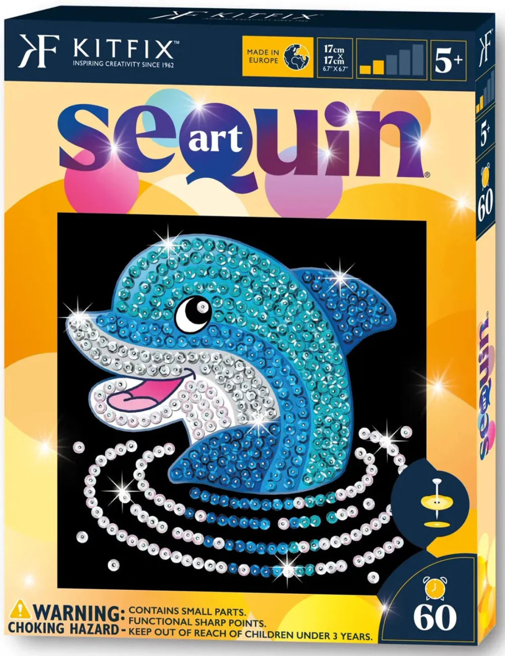 The Dolphin Sequin Art craft kit from the 60 range, including a polystyrene base, coloured picture, coloured sequins, pins, instructions