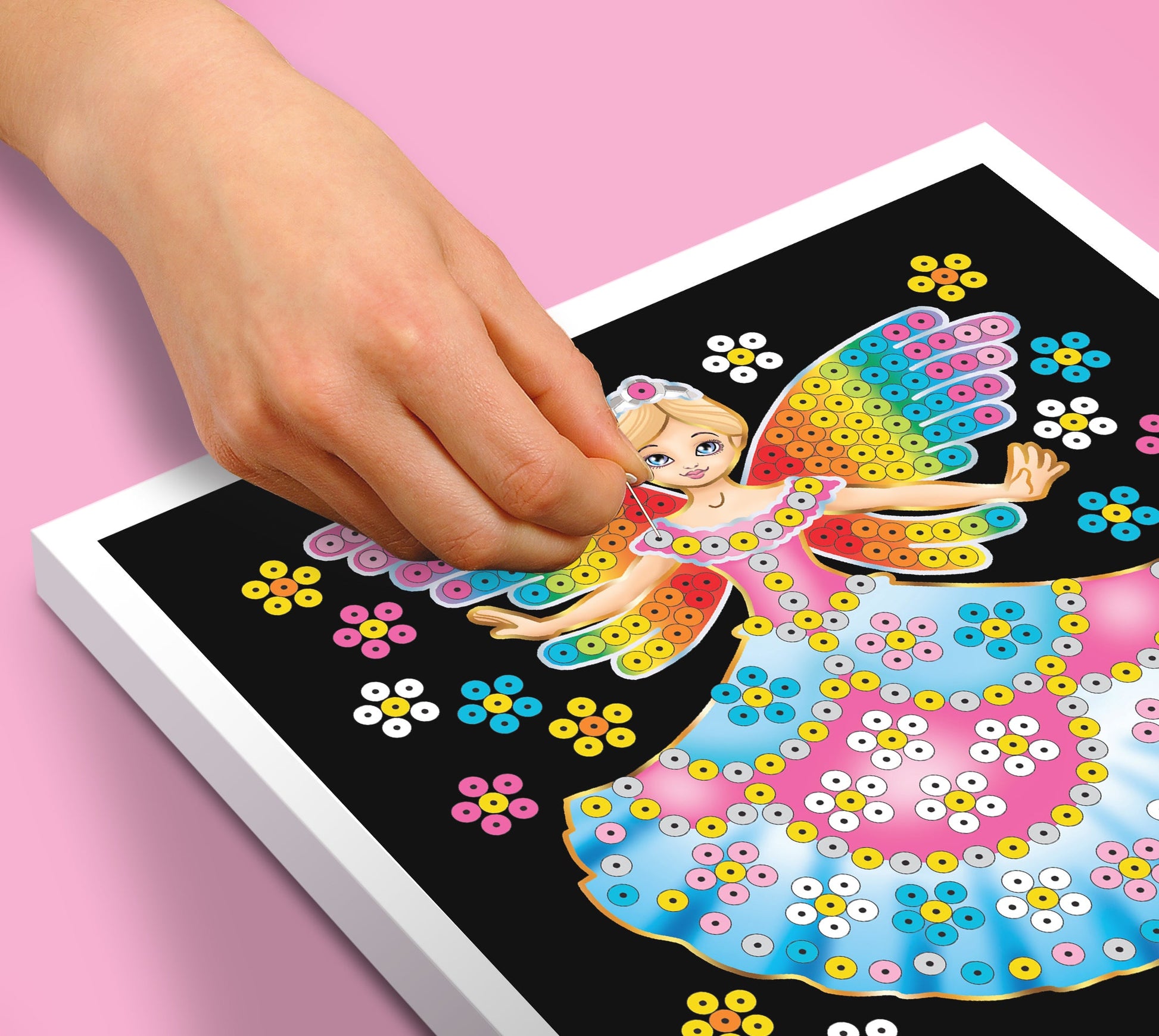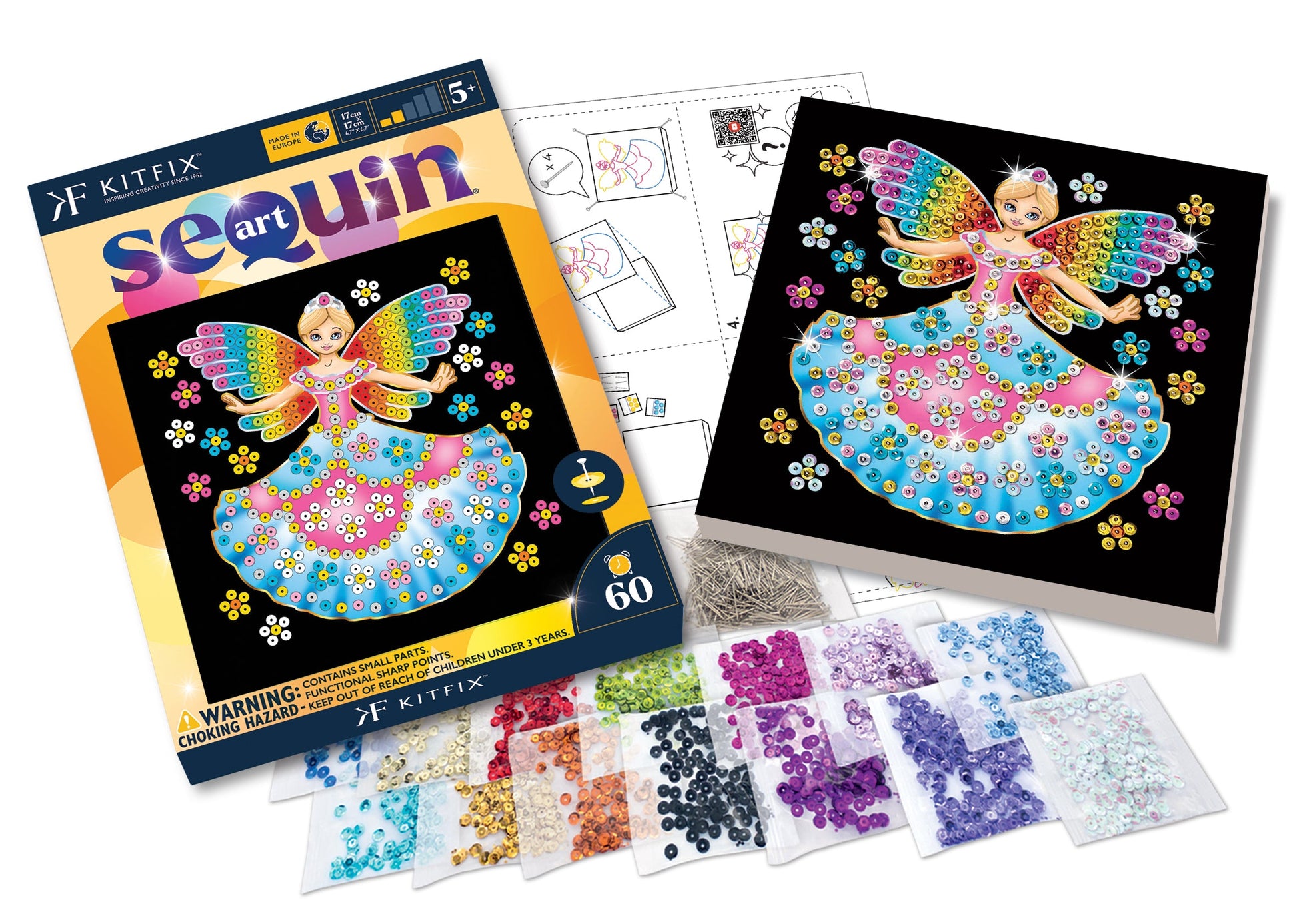The Fairy Sequin Art craft kit from the 60 range, including a polystyrene base, coloured picture, coloured sequins, pins, instructions