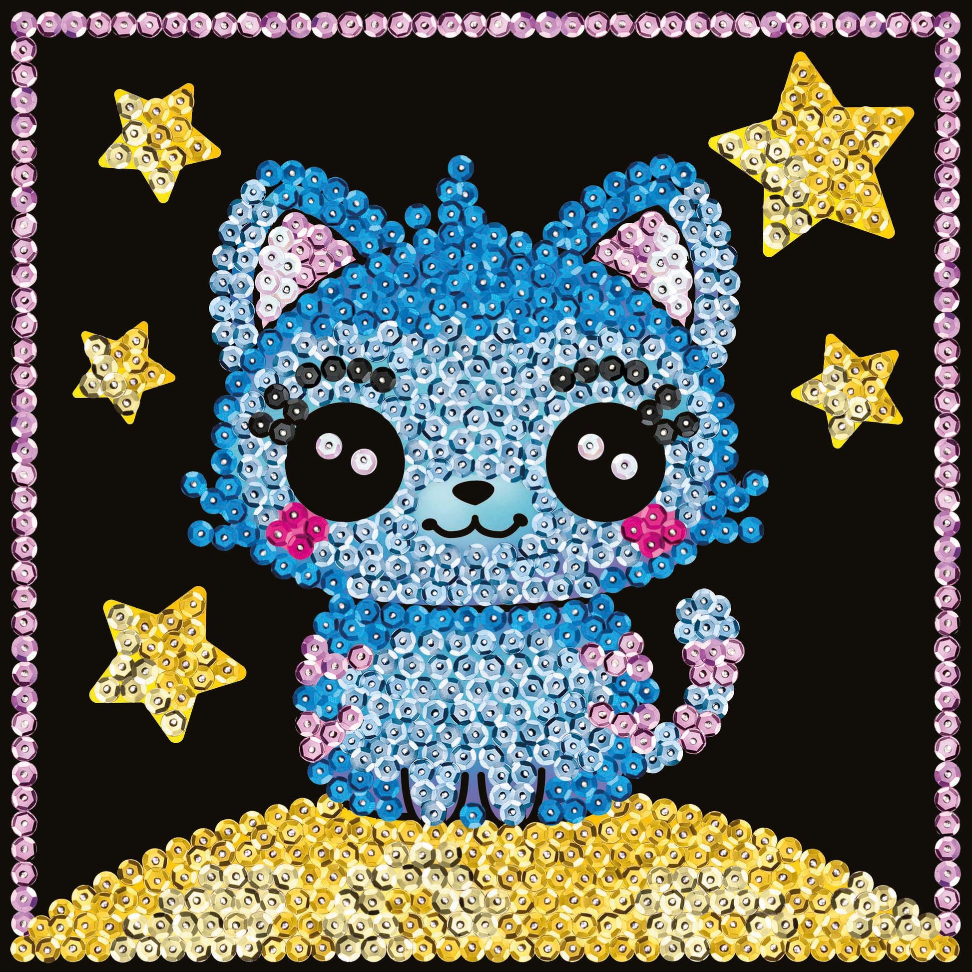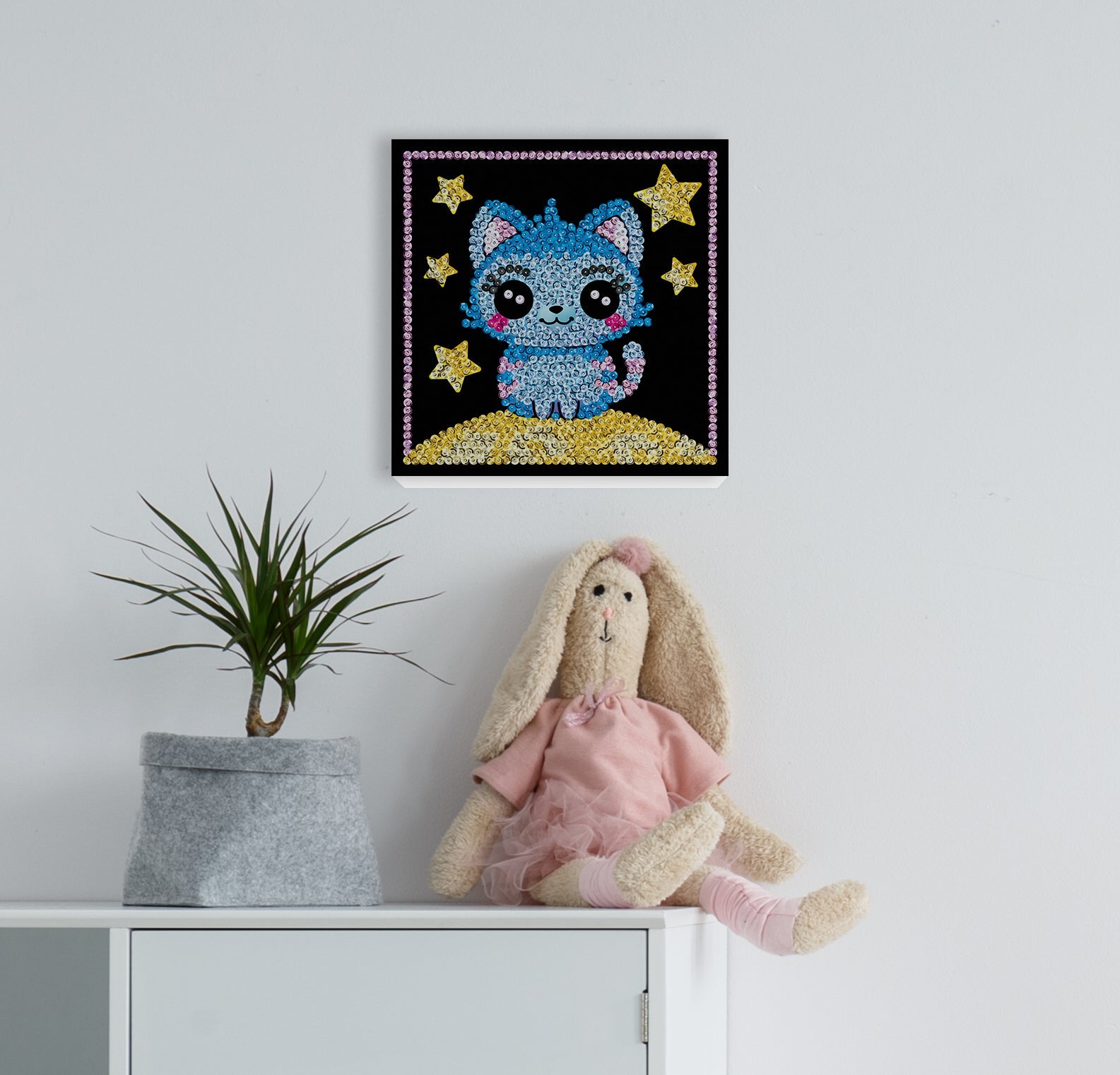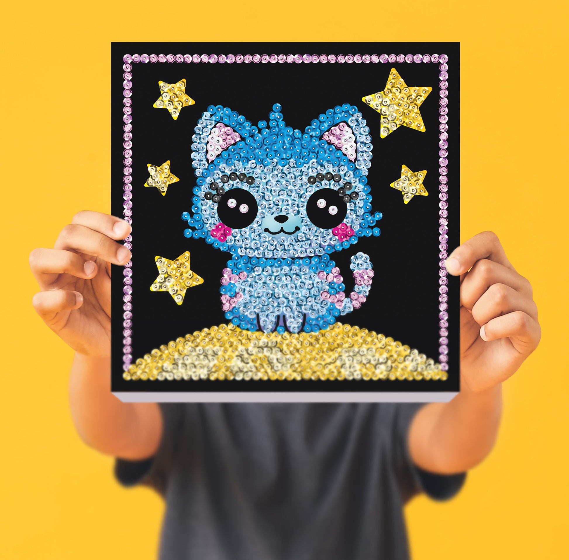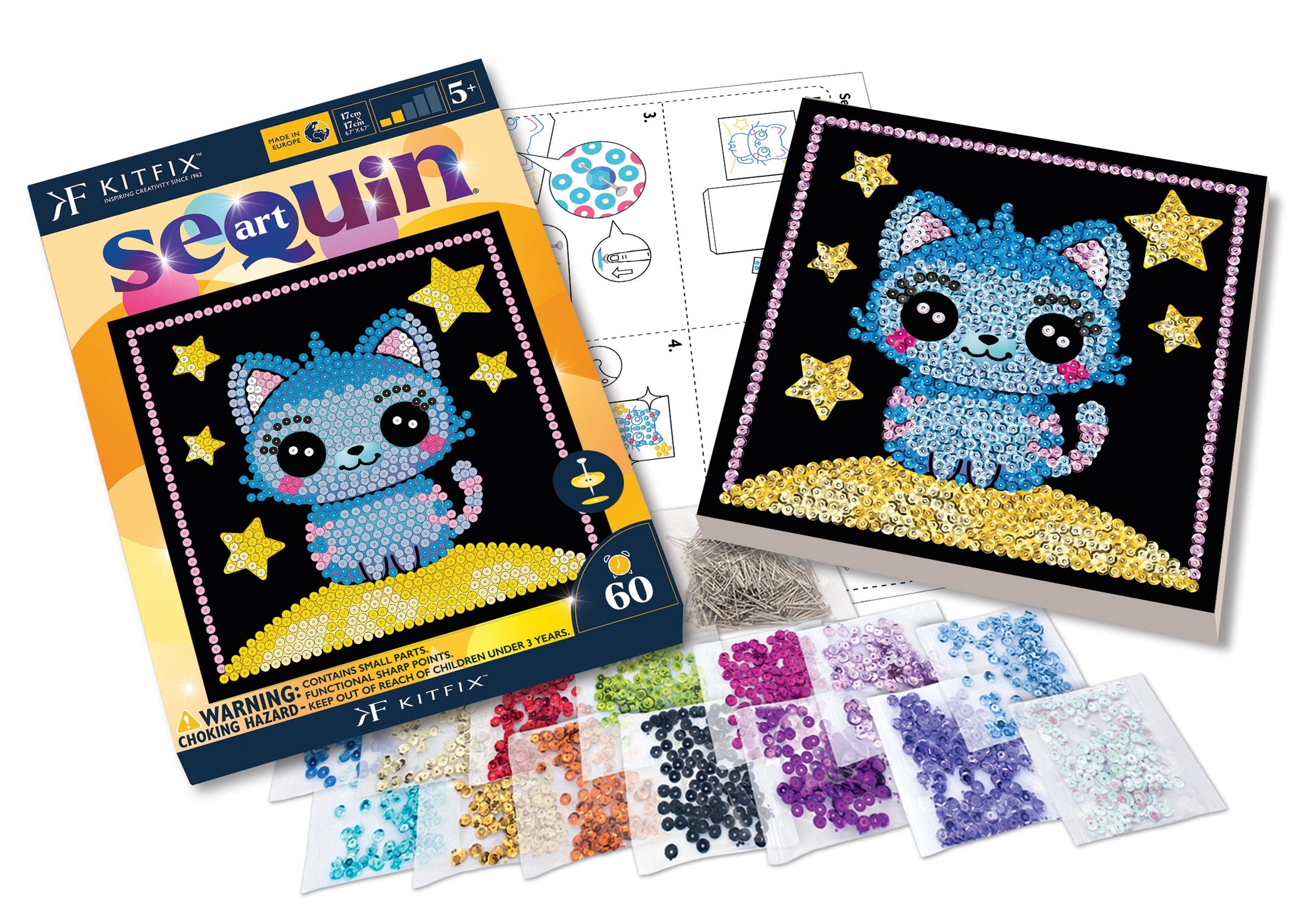 The Kitten Sequin Art craft kit from the 60 range, including a polystyrene base, coloured picture, coloured sequins, pins, instructions