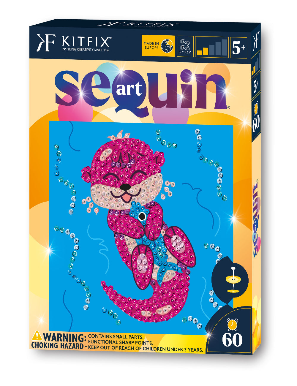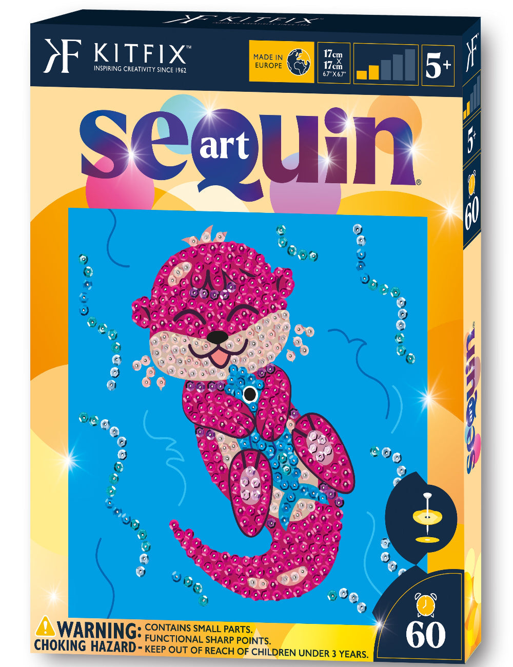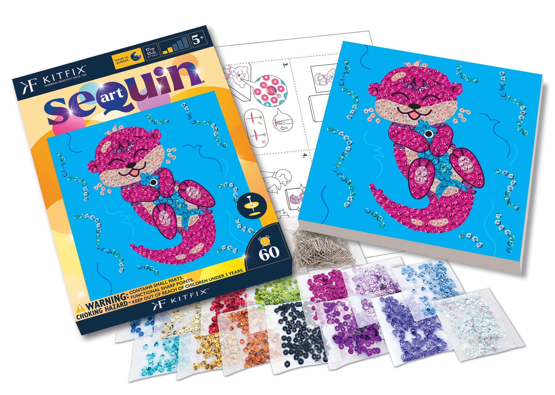 The Otter Sequin Art craft kit from the 60 range, including a polystyrene base, coloured picture, coloured sequins, pins, instructions