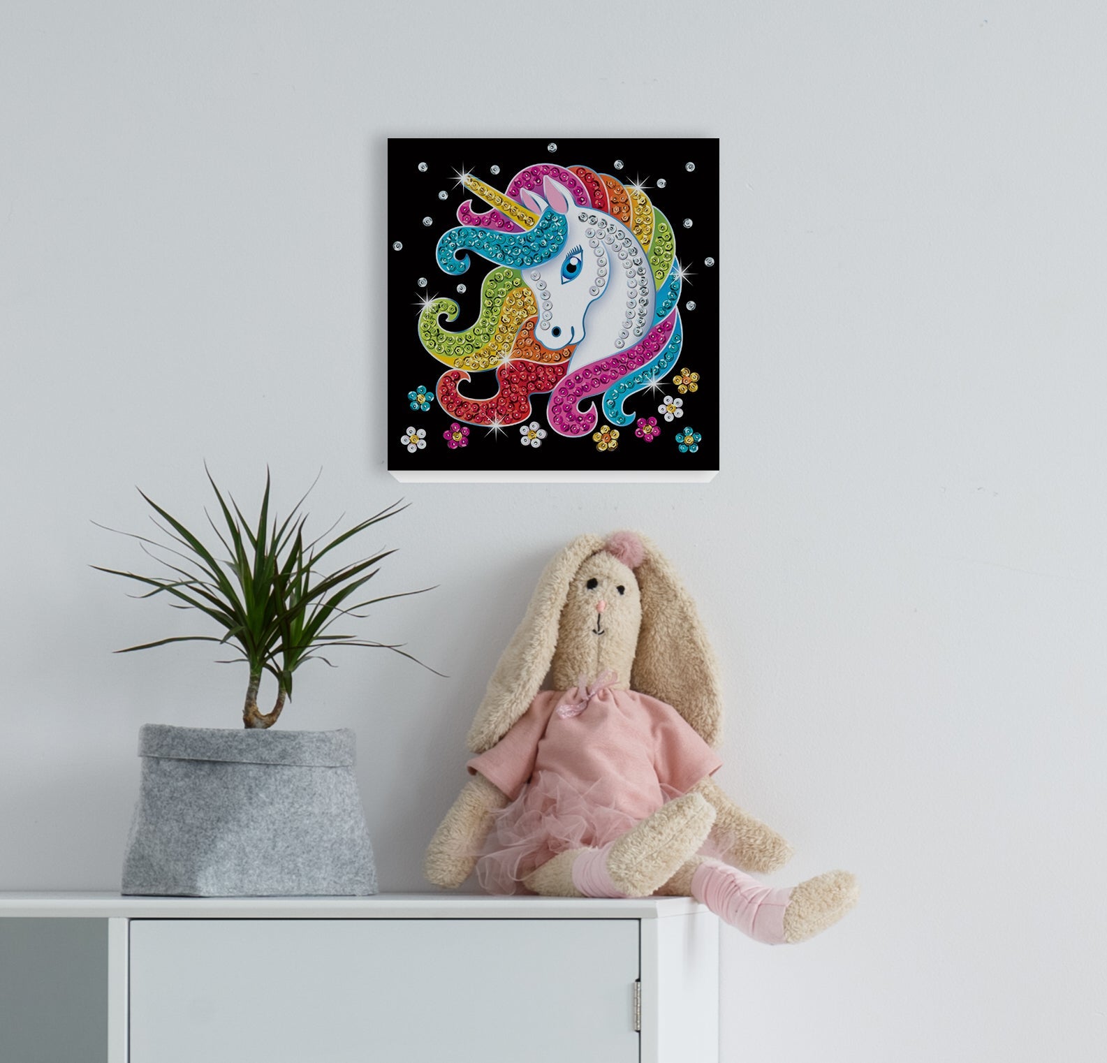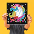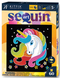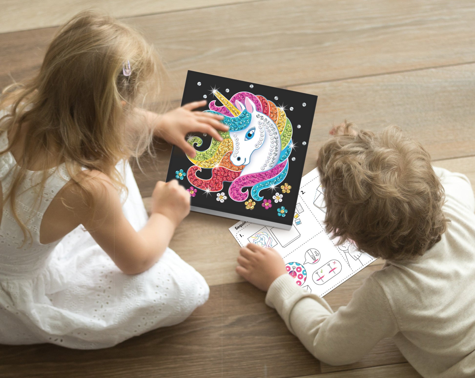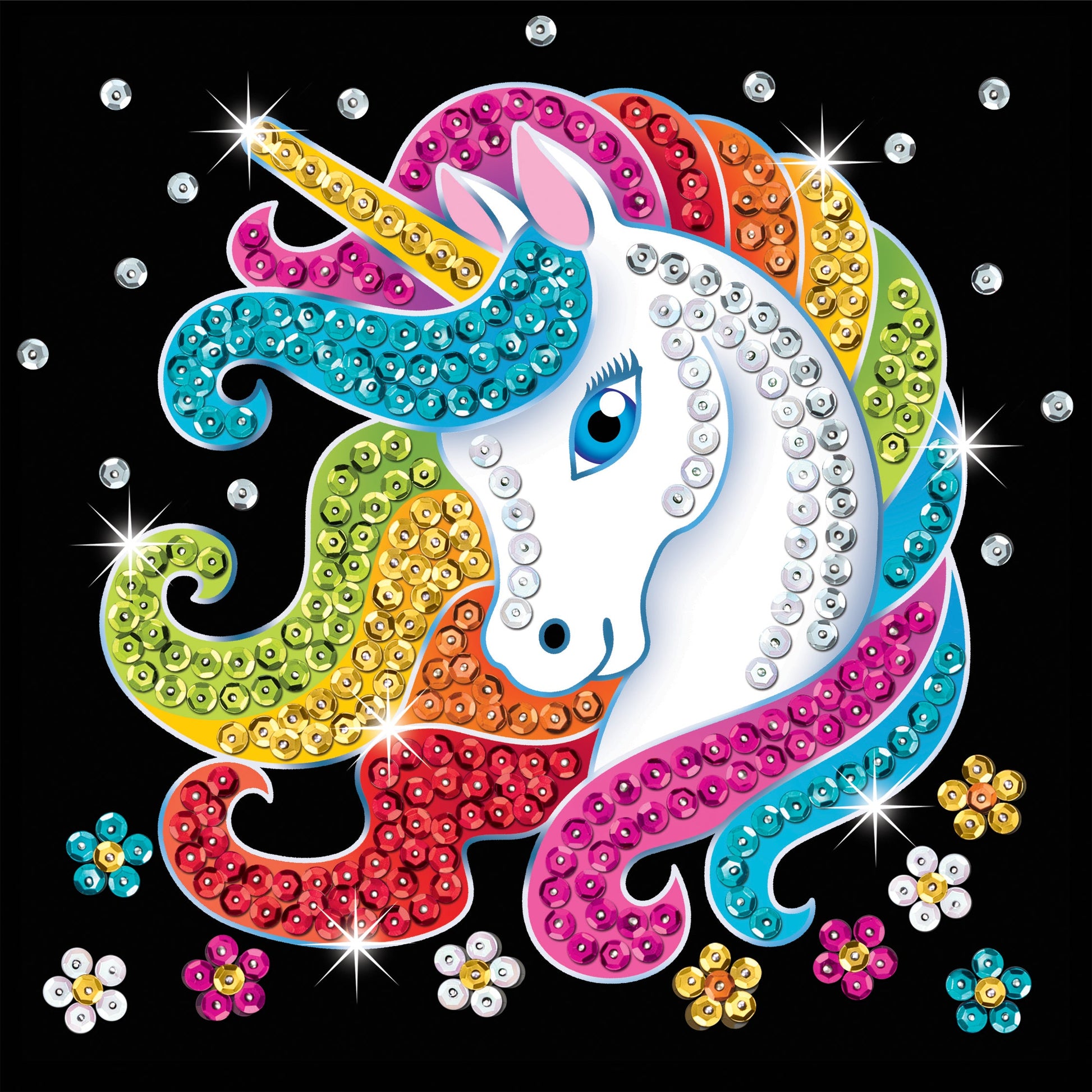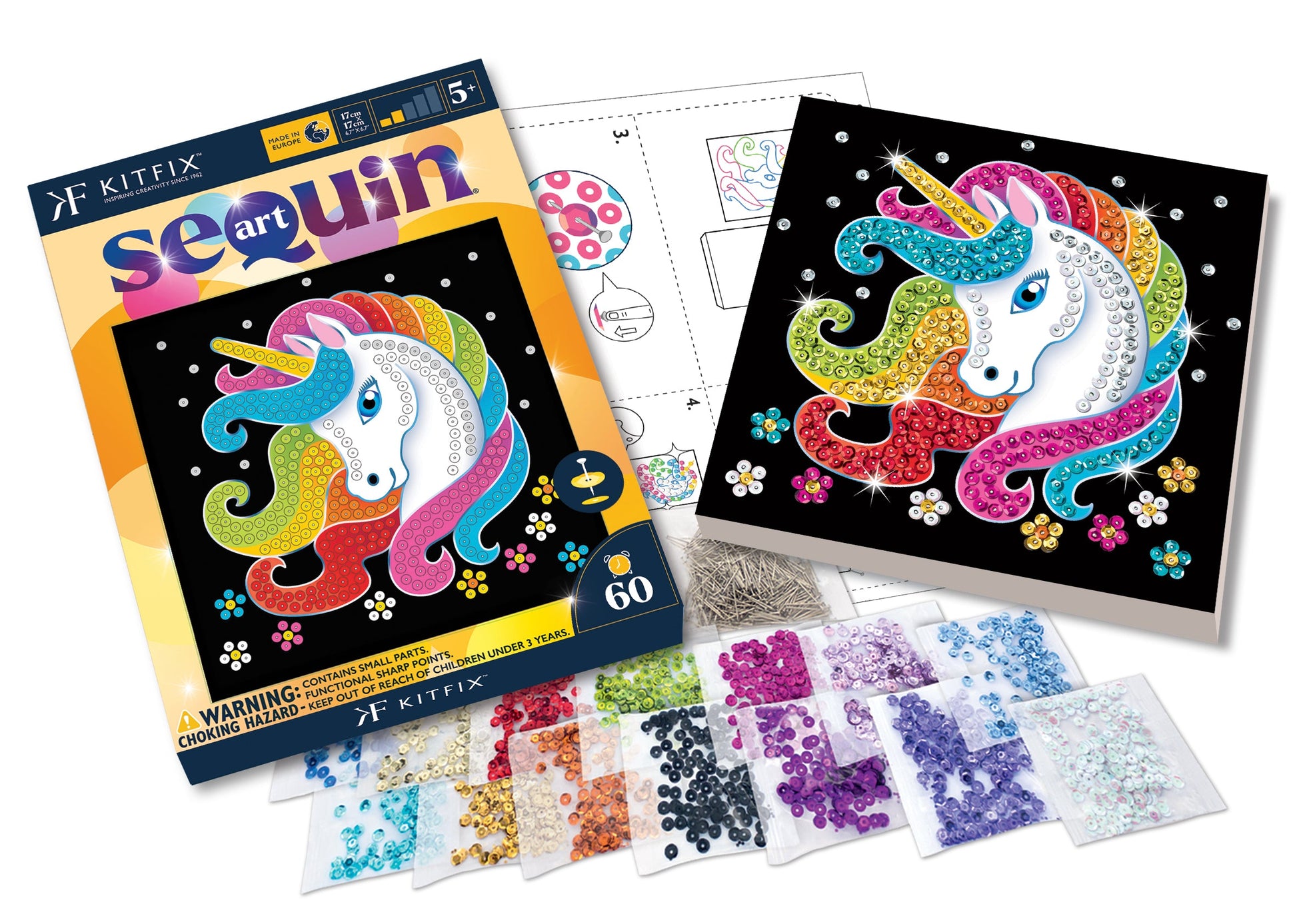 The Unicorn Sequin Art craft kit from the 60 range, including a polystyrene base, coloured picture, coloured sequins, pins, instructions