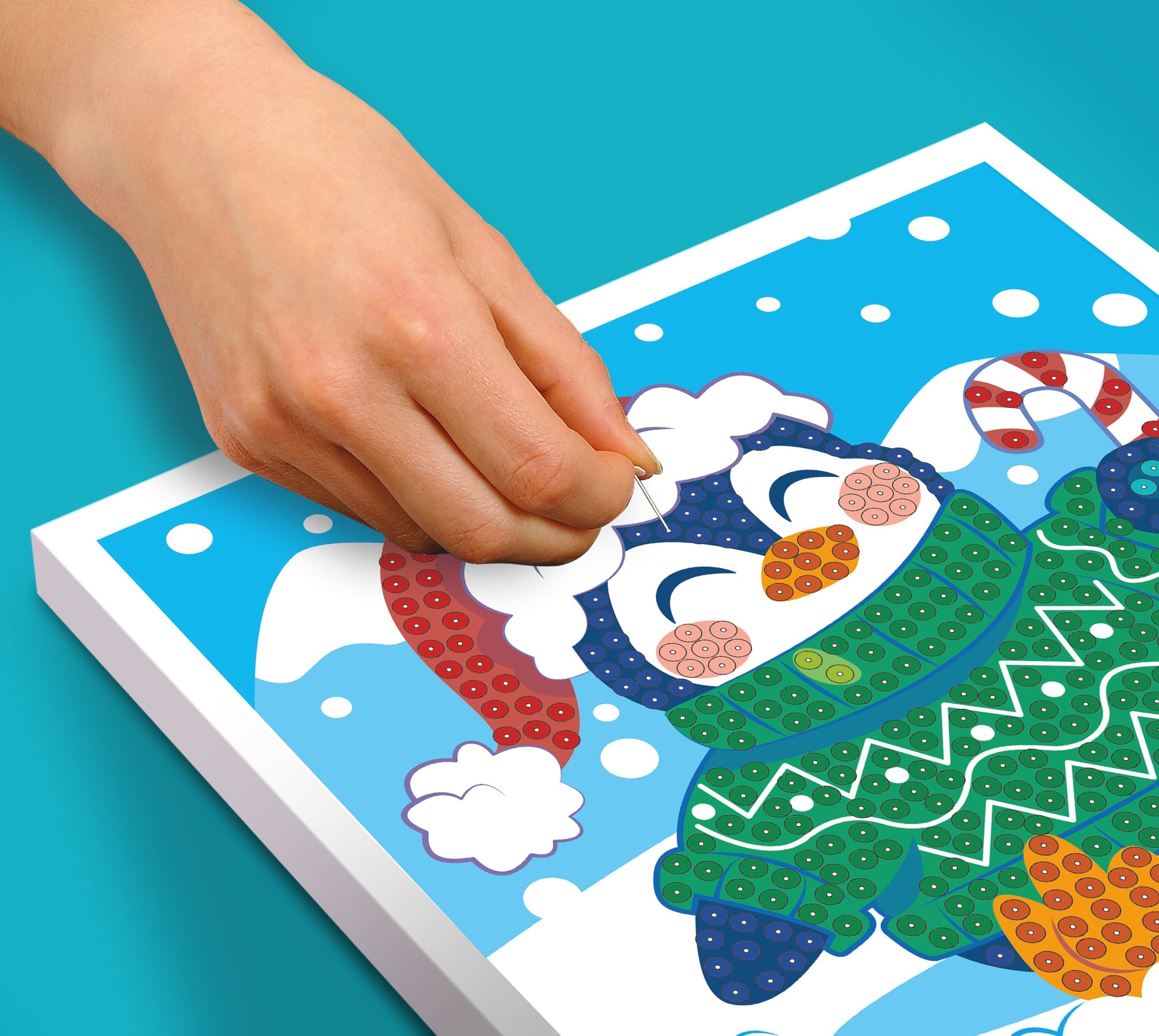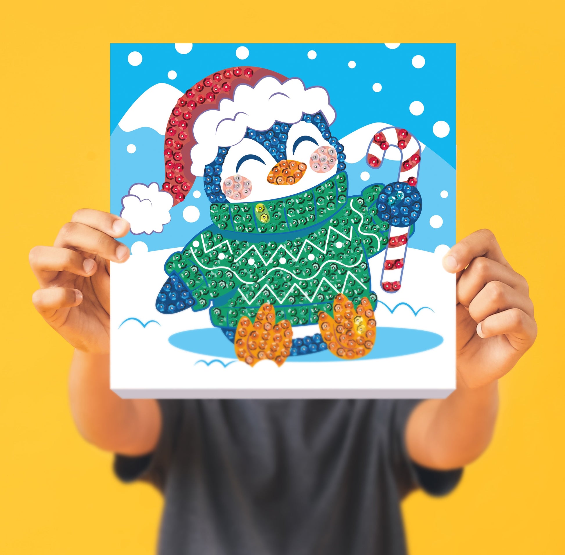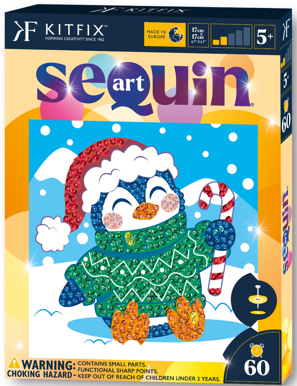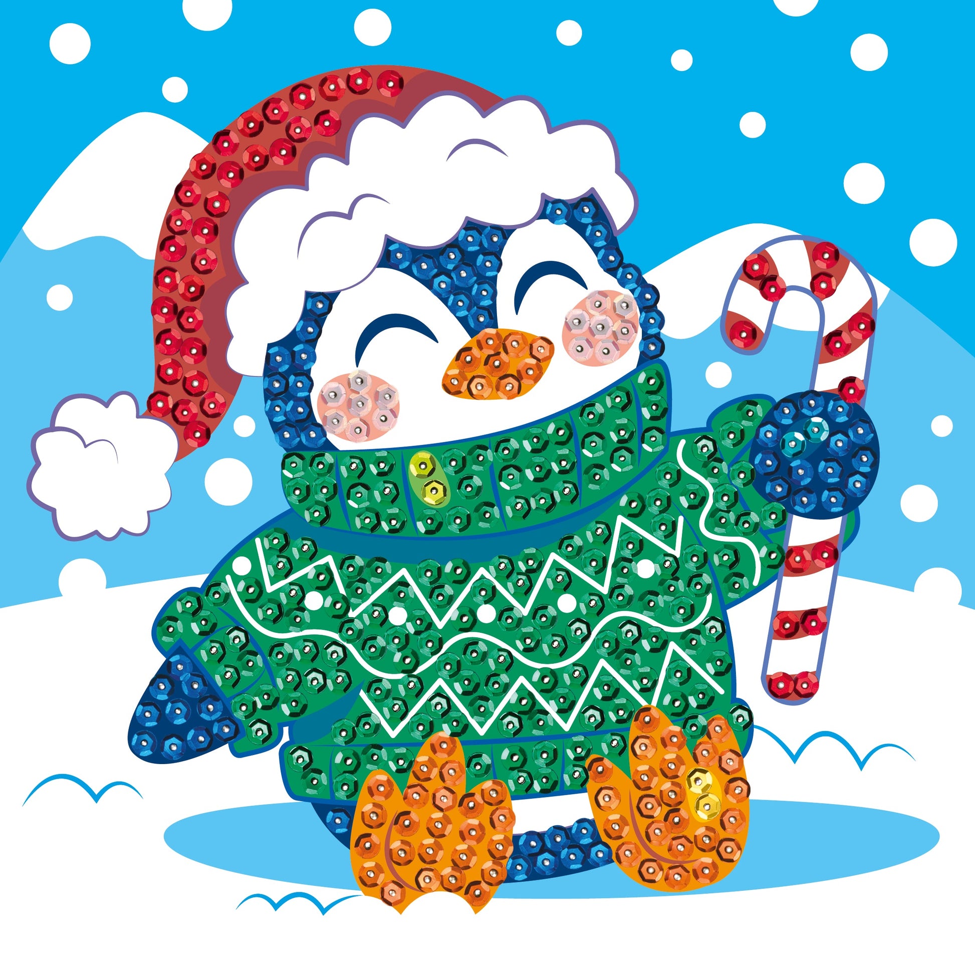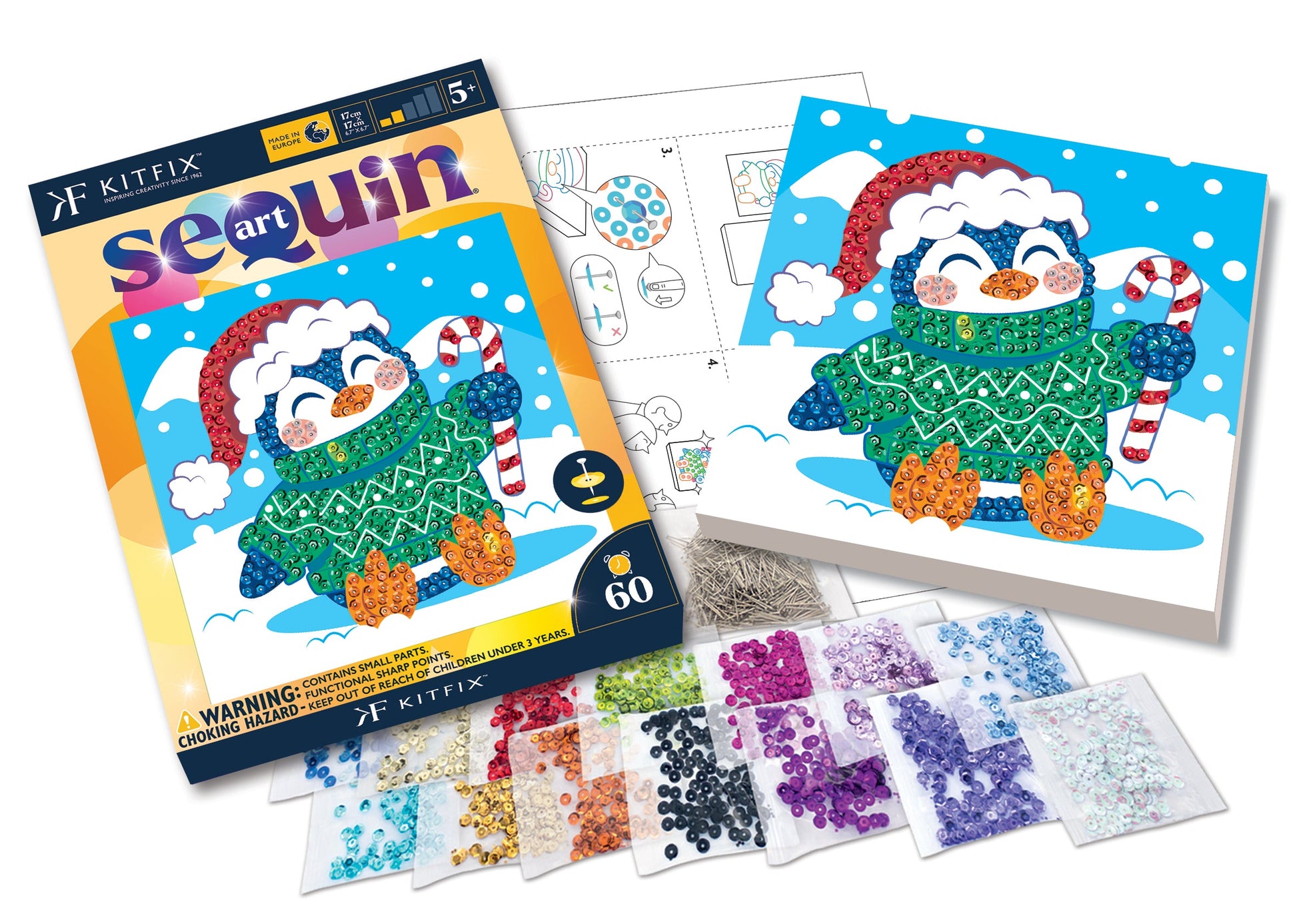 The Winter Penguin Sequin Art craft kit from the 60 range, including a polystyrene base, coloured picture, coloured sequins, pins, instructions