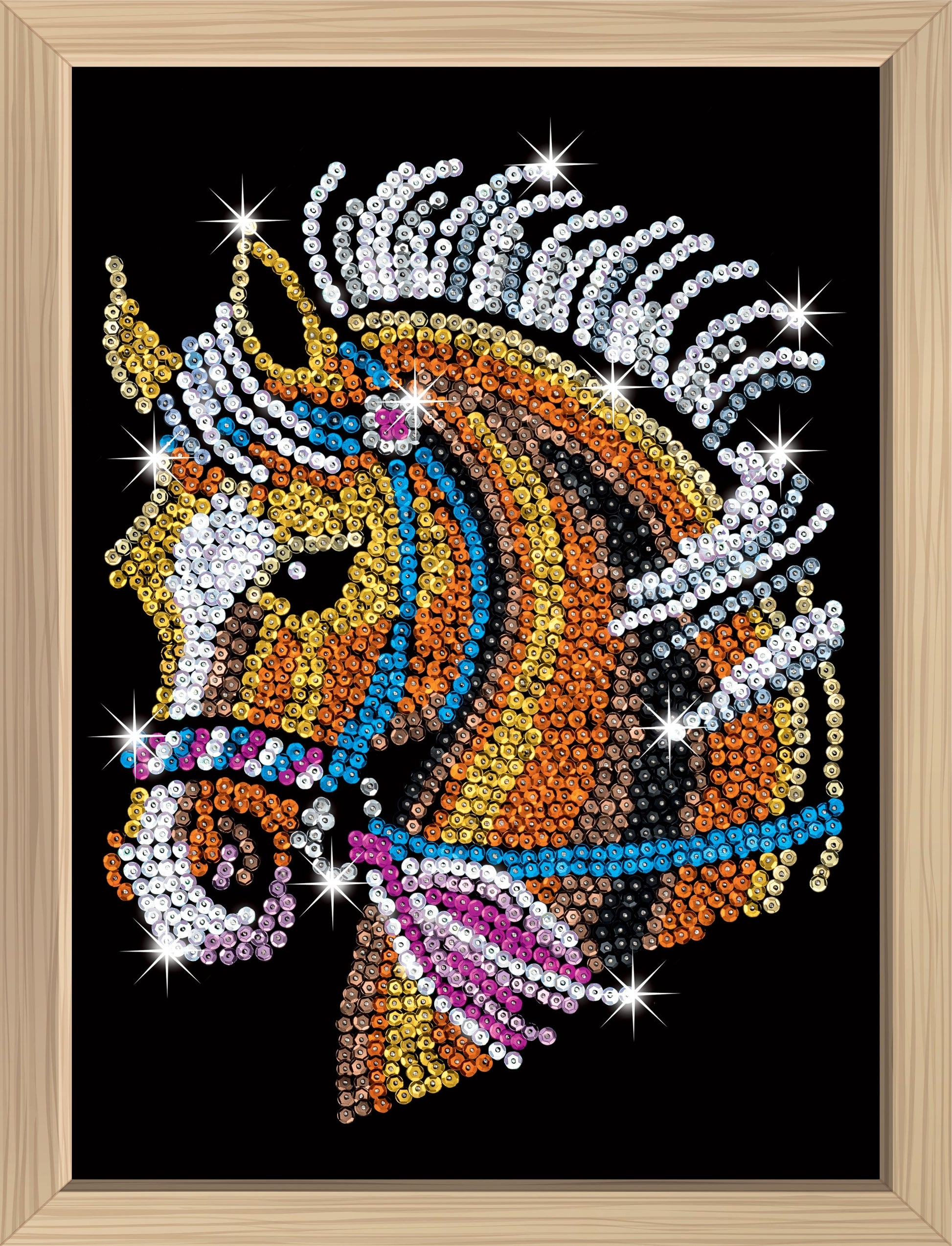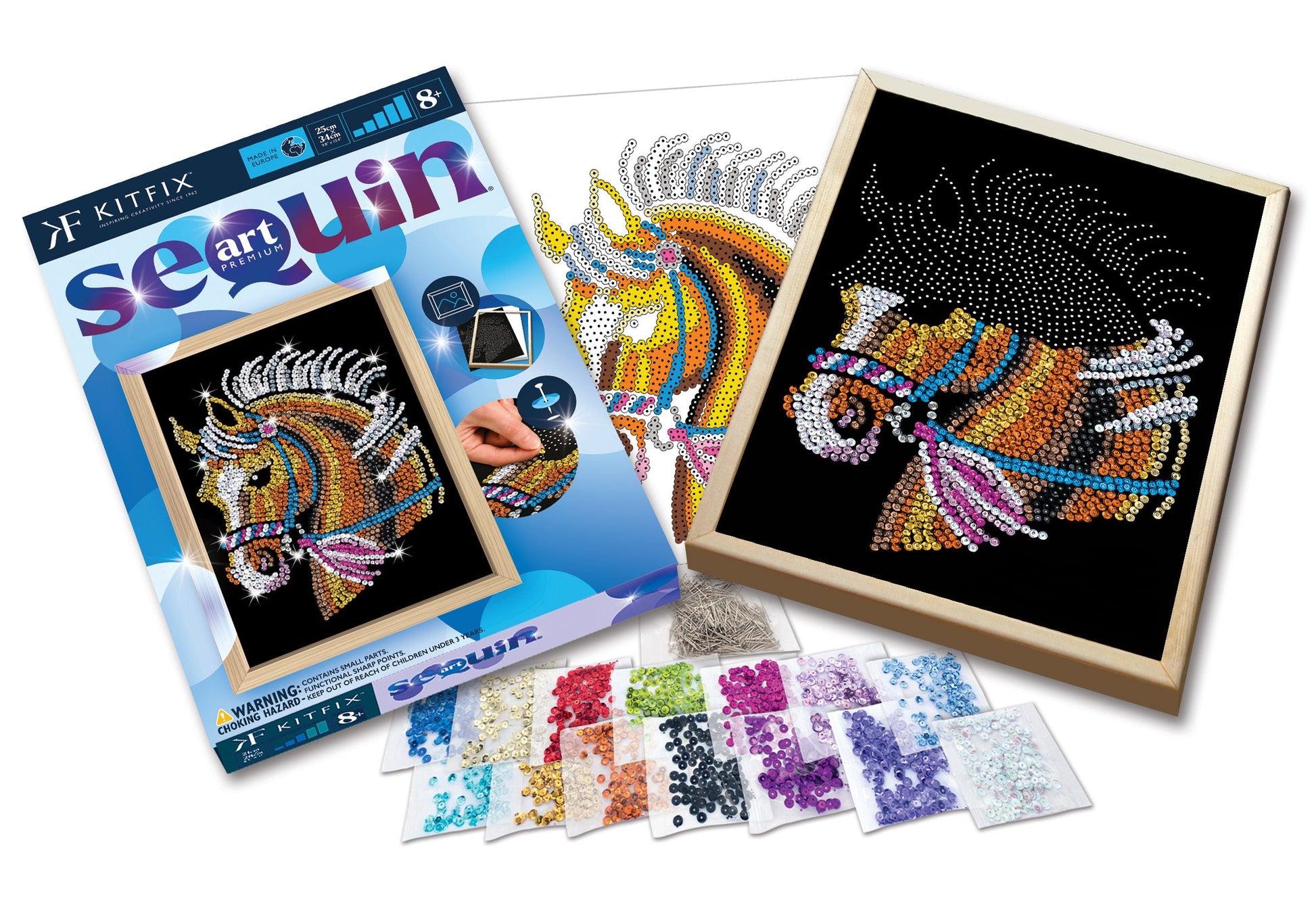 The Horse Sequin Art craft kit from the Blue Premium range, including a polystyrene base, flocked picture, coloured sequins, pins, instructions, wooden frame, colour instruction leaflet, adhesive tabs