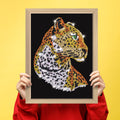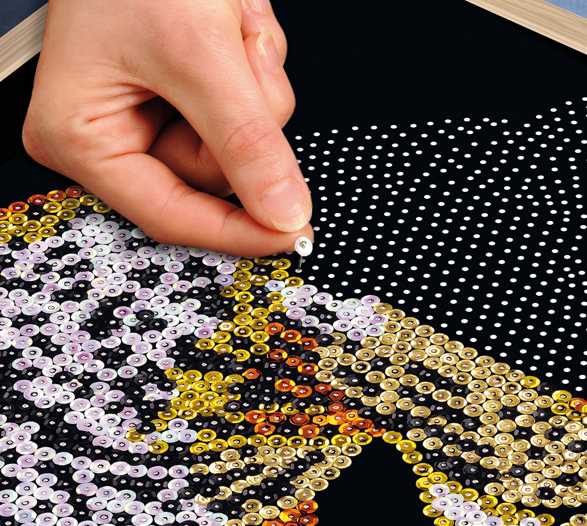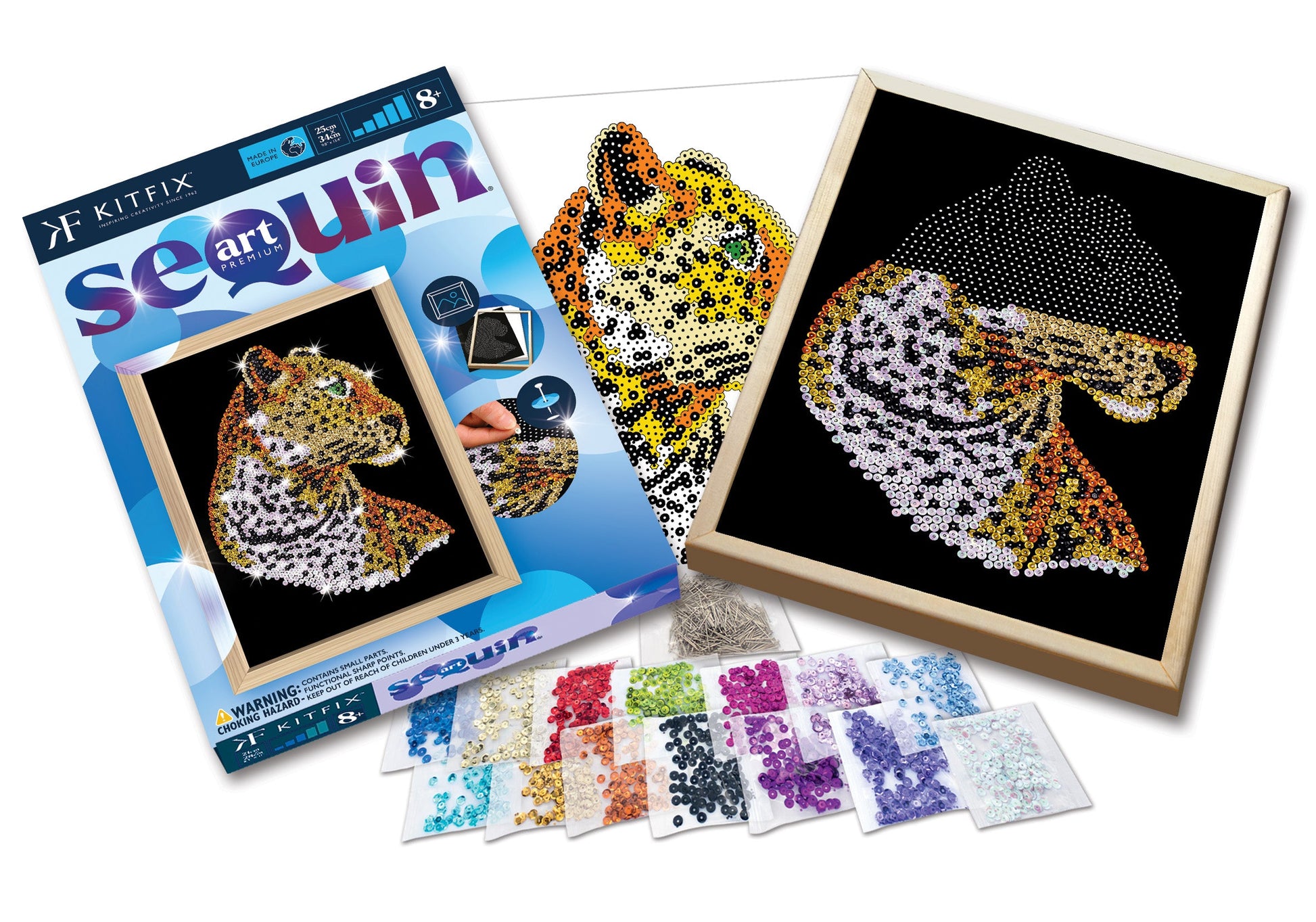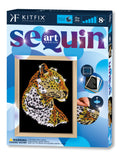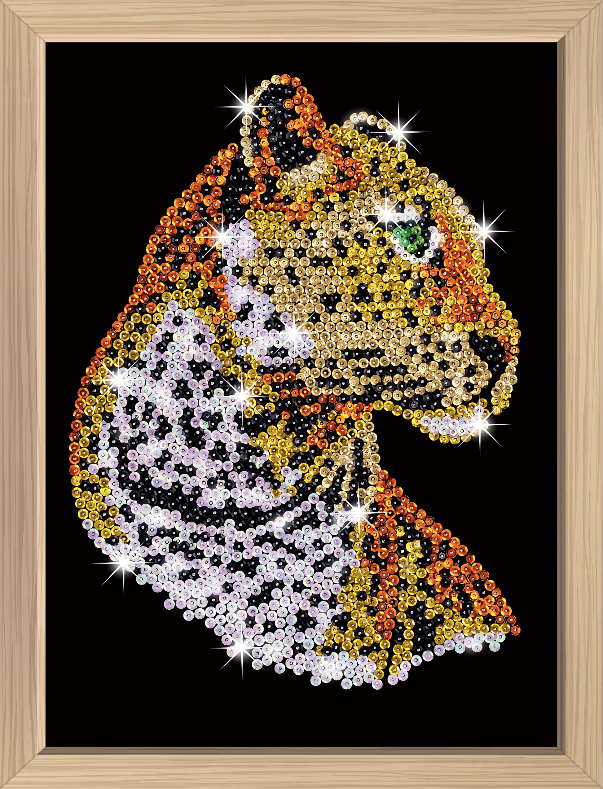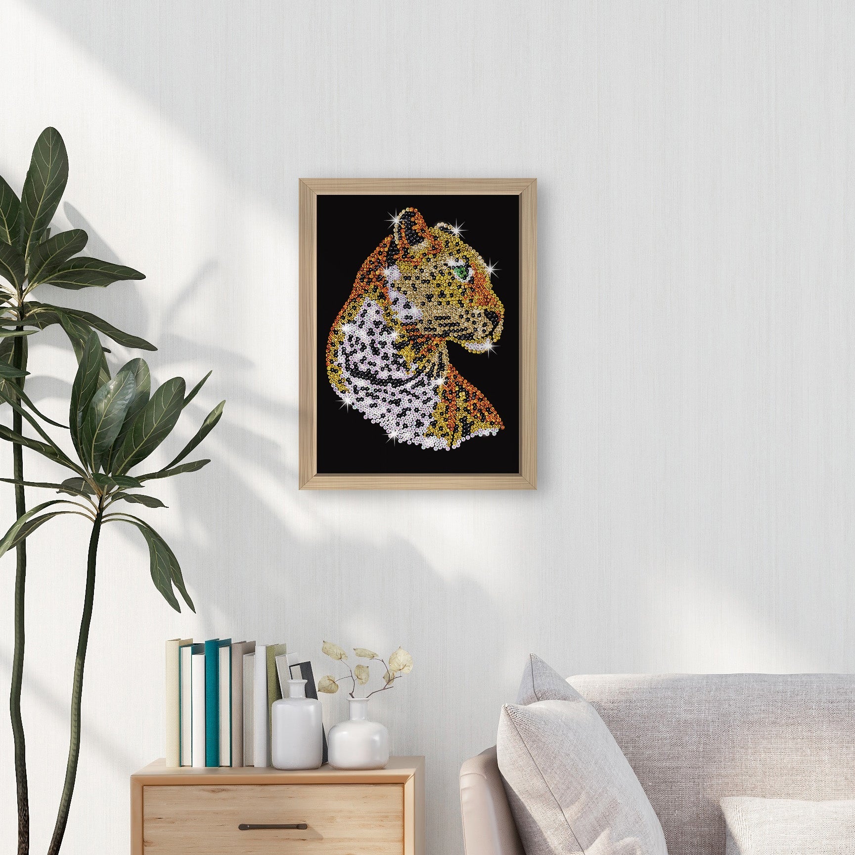 The Leopard Sequin Art craft kit from the Blue Premium range, including a polystyrene base, flocked picture, coloured sequins, pins, instructions, wooden frame, colour instruction leaflet, adhesive tabs