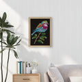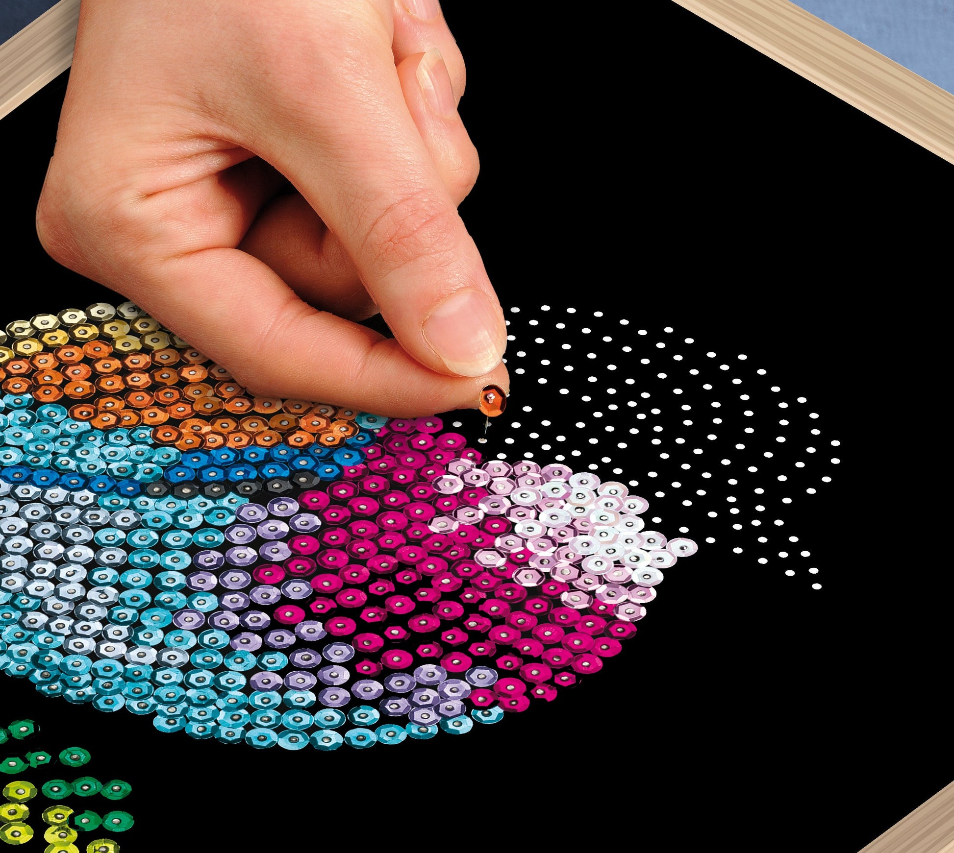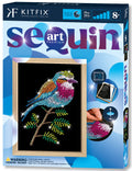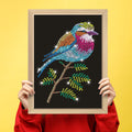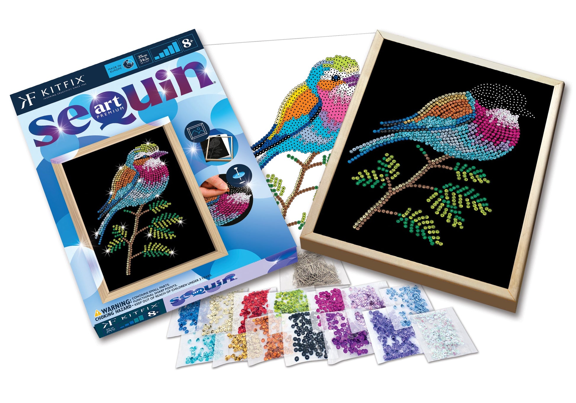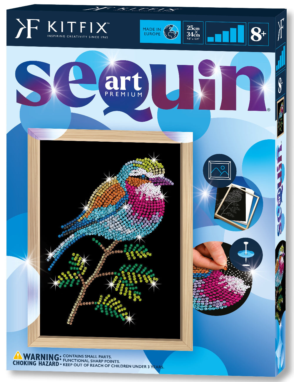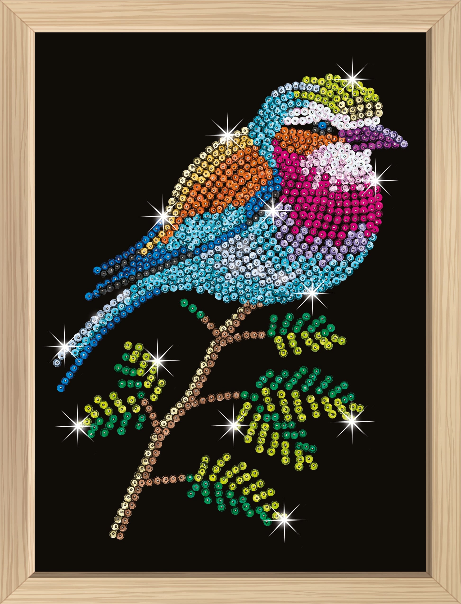 The Lilac Breasted Roller Sequin Art craft kit from the Blue Premium range, including a polystyrene base, flocked picture, coloured sequins, pins, instructions, wooden frame, colour instruction leaflet, adhesive tabs