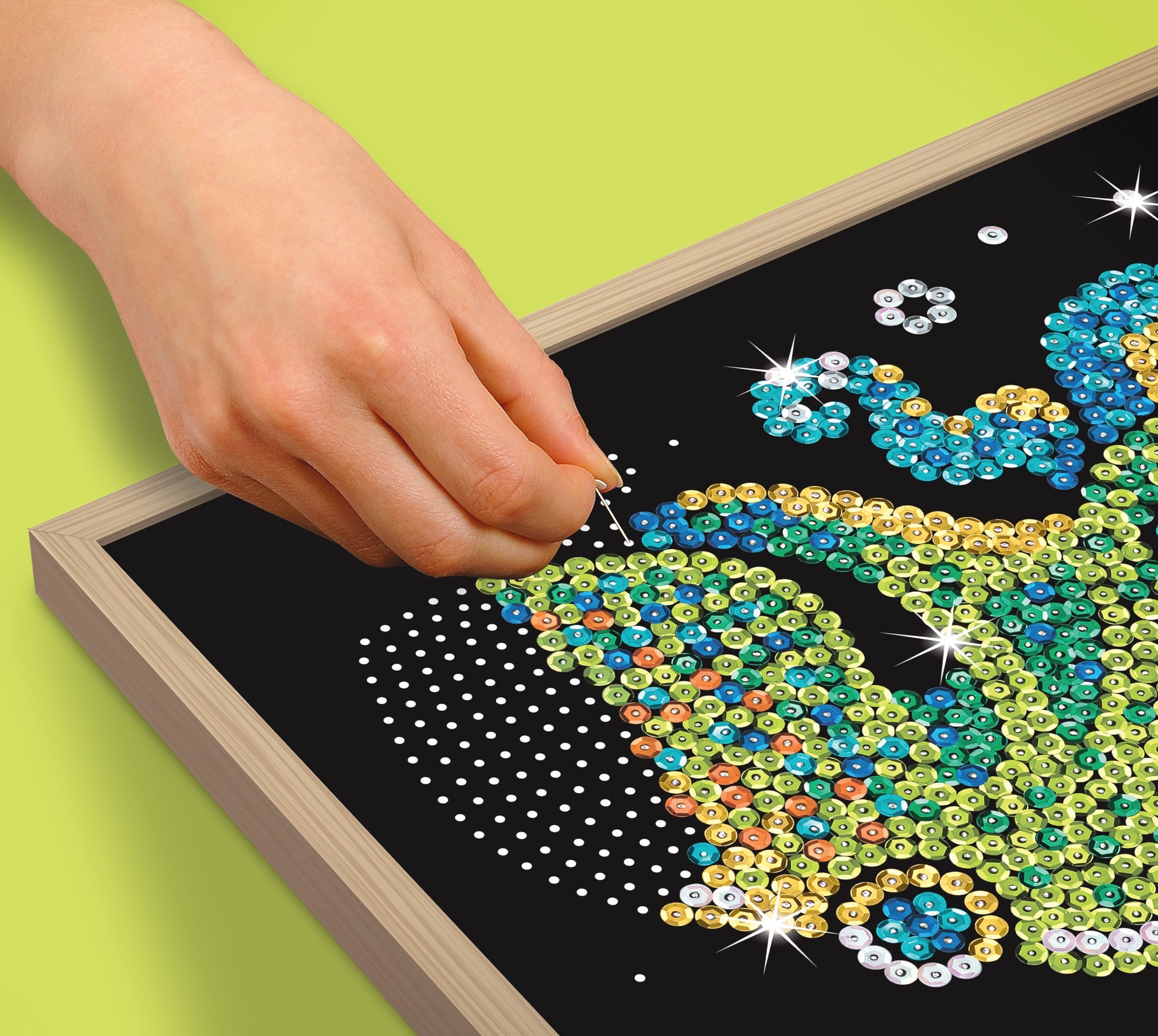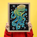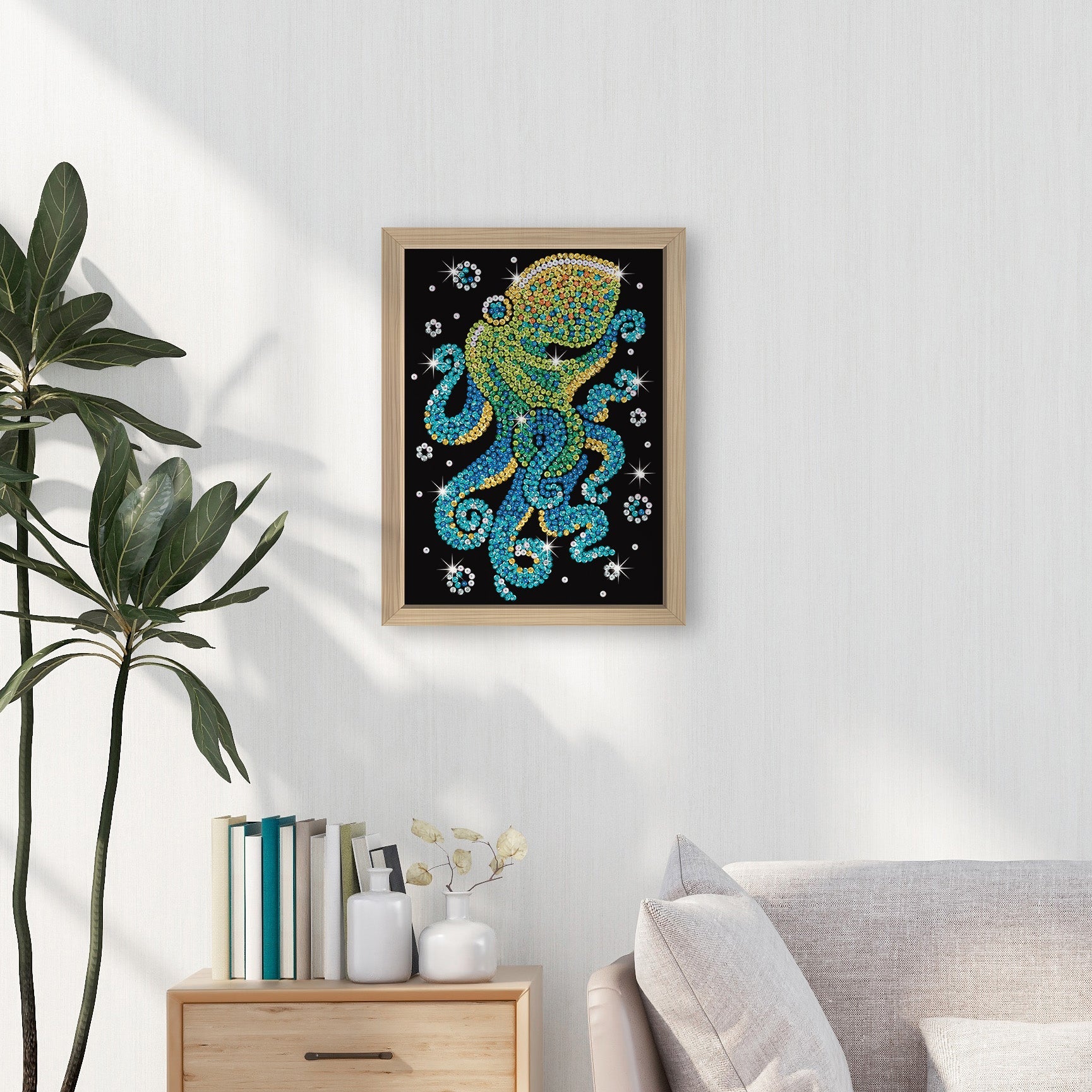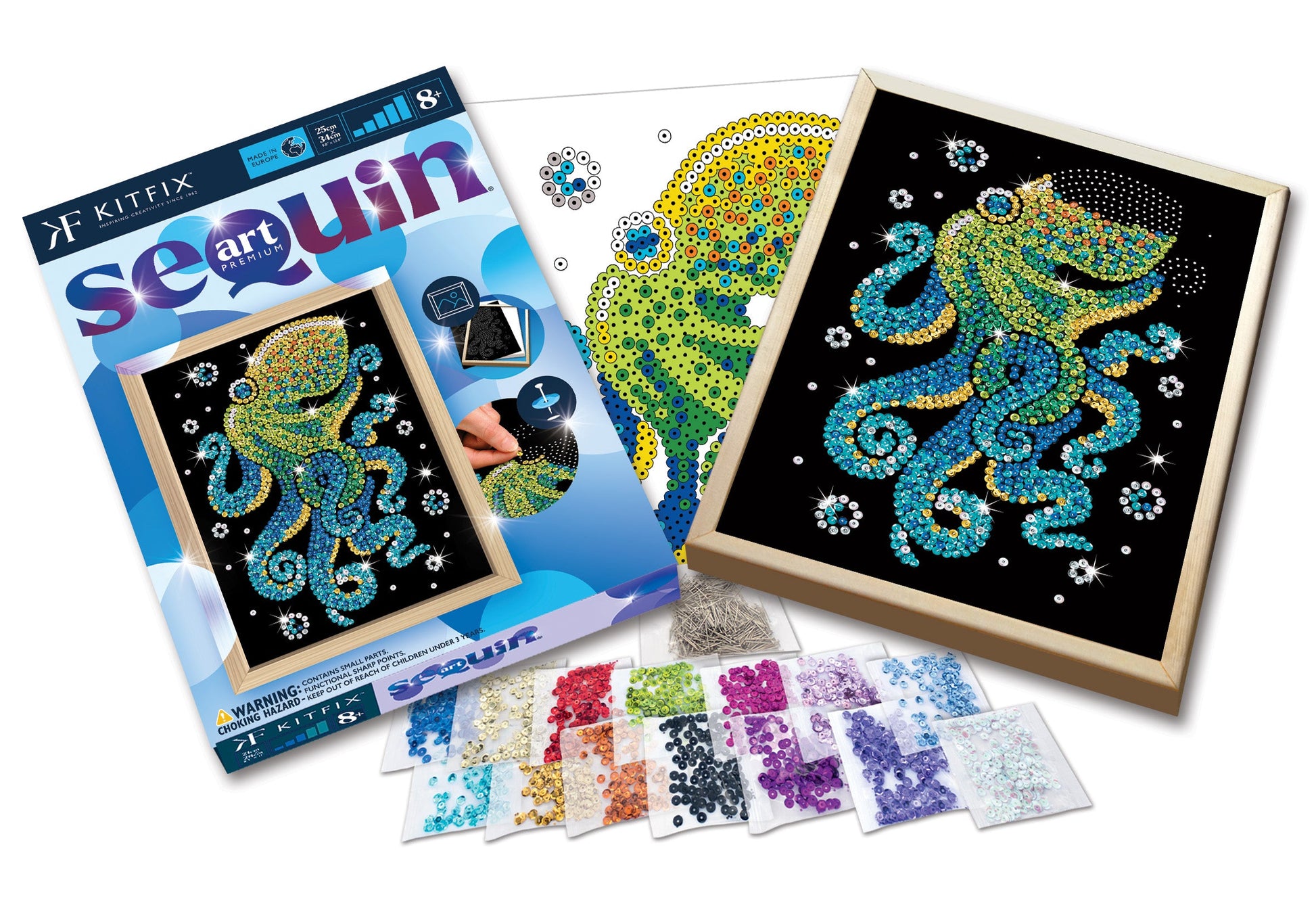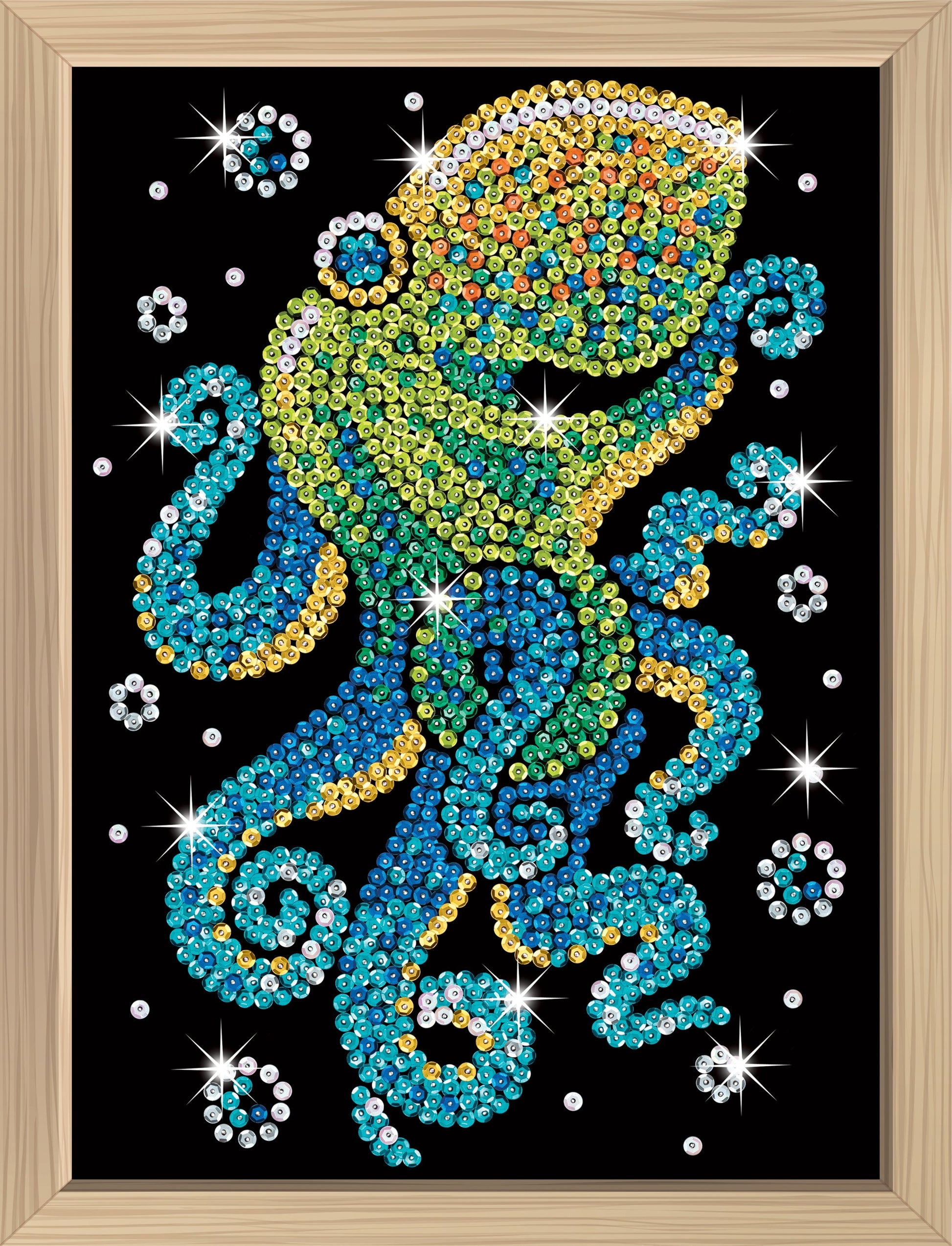 The Octopus Sequin Art craft kit from the Blue Premium range, including a polystyrene base, flocked picture, coloured sequins, pins, instructions, wooden frame, colour instruction leaflet, adhesive tabs