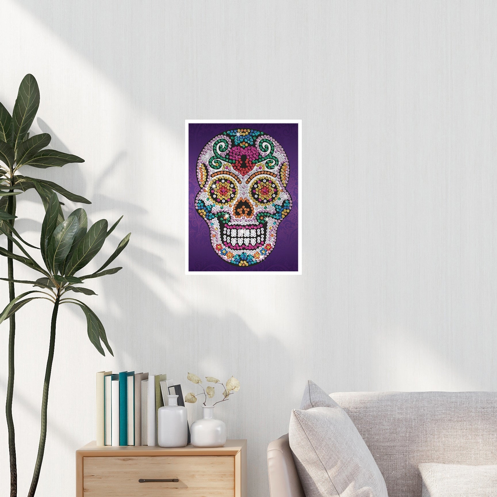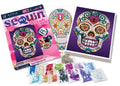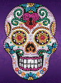 The Sugar Skull Sequin Art craft kit from the Craft Teen range, including a polystyrene base, coloured wrap around picture, coloured sequins, pins, instructions, adhesive tabs