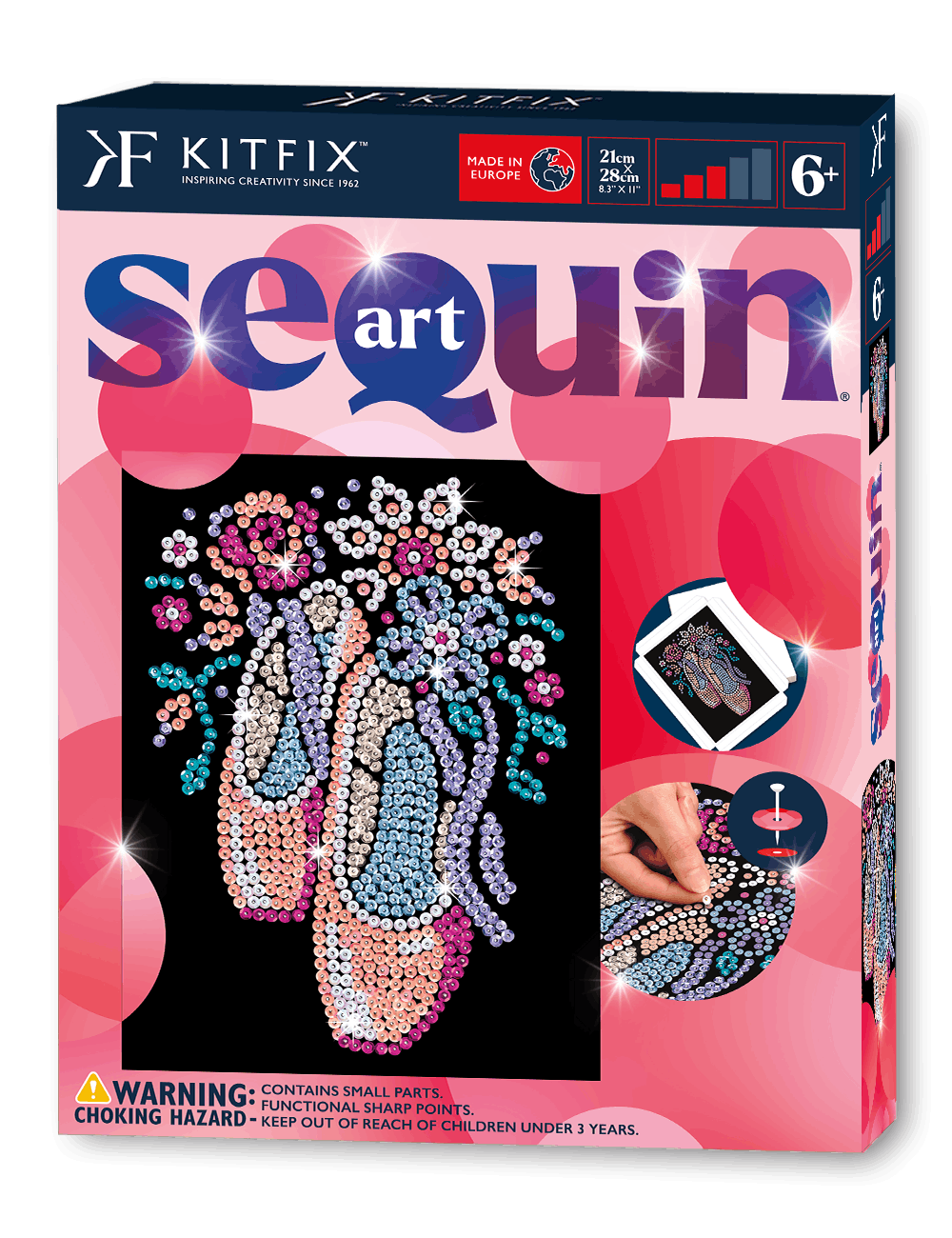 The Ballet Shoes Sequin Art craft kit from the Red range, including a polystyrene base, coloured wrap around picture, coloured sequins, pins, instructions, adhesive tabs