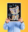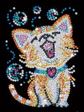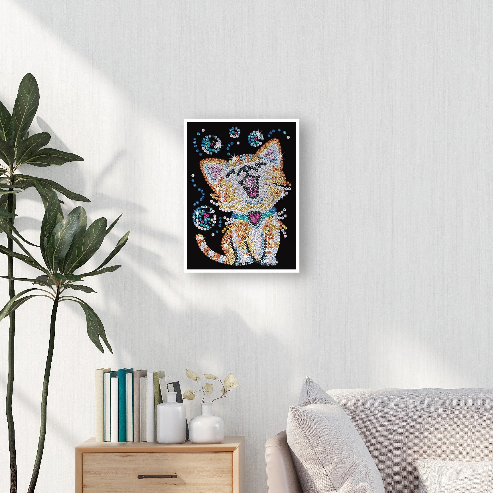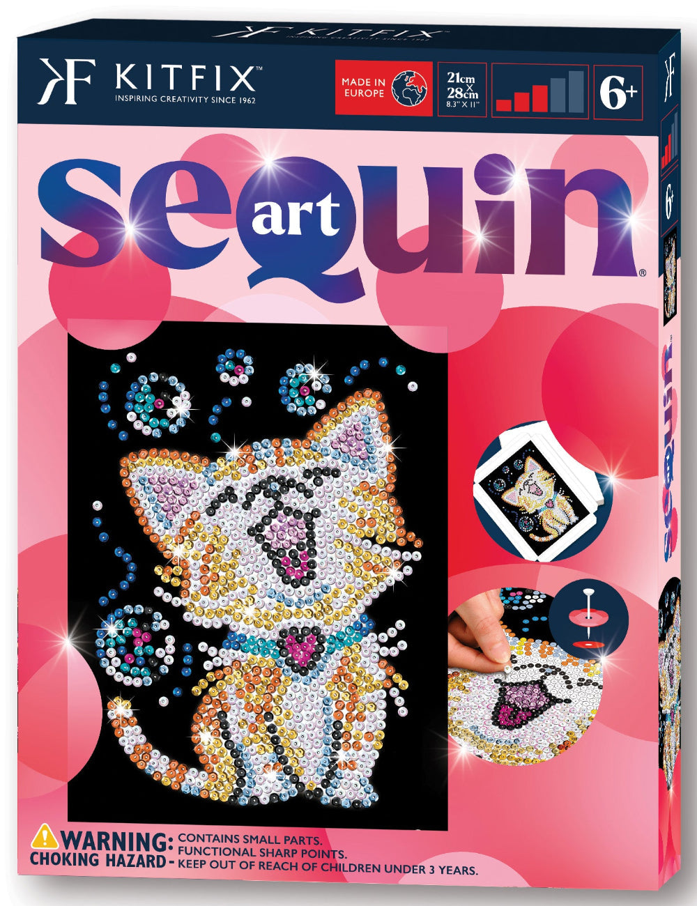The Bubbles the Kitten Sequin Art craft kit from the Red range, including a polystyrene base, coloured wrap around picture, coloured sequins, pins, instructions, adhesive tabs